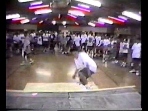 I first experienced skateboarding when I was around 8 or 9 years old. Some teenagers had a quarter pipe at the end of the apartment complex. I convinced my mom to buy me a Madrid Beau Brown complete setup from the local skate shop. When the teenagers went inside for dinner, I decided to try the quarter pipe unsupervised. I only observed what the older kids were doing such as kick turns and grinds, so I never practiced physically. I took my newborn baby deer skate legs and went for a grind. [I assume] I only made it halfway up the ramp. [Next thing I saw was] plywood, evening sky, then being woken up by this teenager named Larry. I proceeded to skate more until I broke my arm by hitting a crack in the concrete just deep and wide enough to immediately seize the rotation of my Powell-Peralta Bones wheels. Mom was not stoked, so she strongly encouraged a break from skating. After a few years of riding and racing motorcycles, I was right back into skating with some new friends in 7th grade.