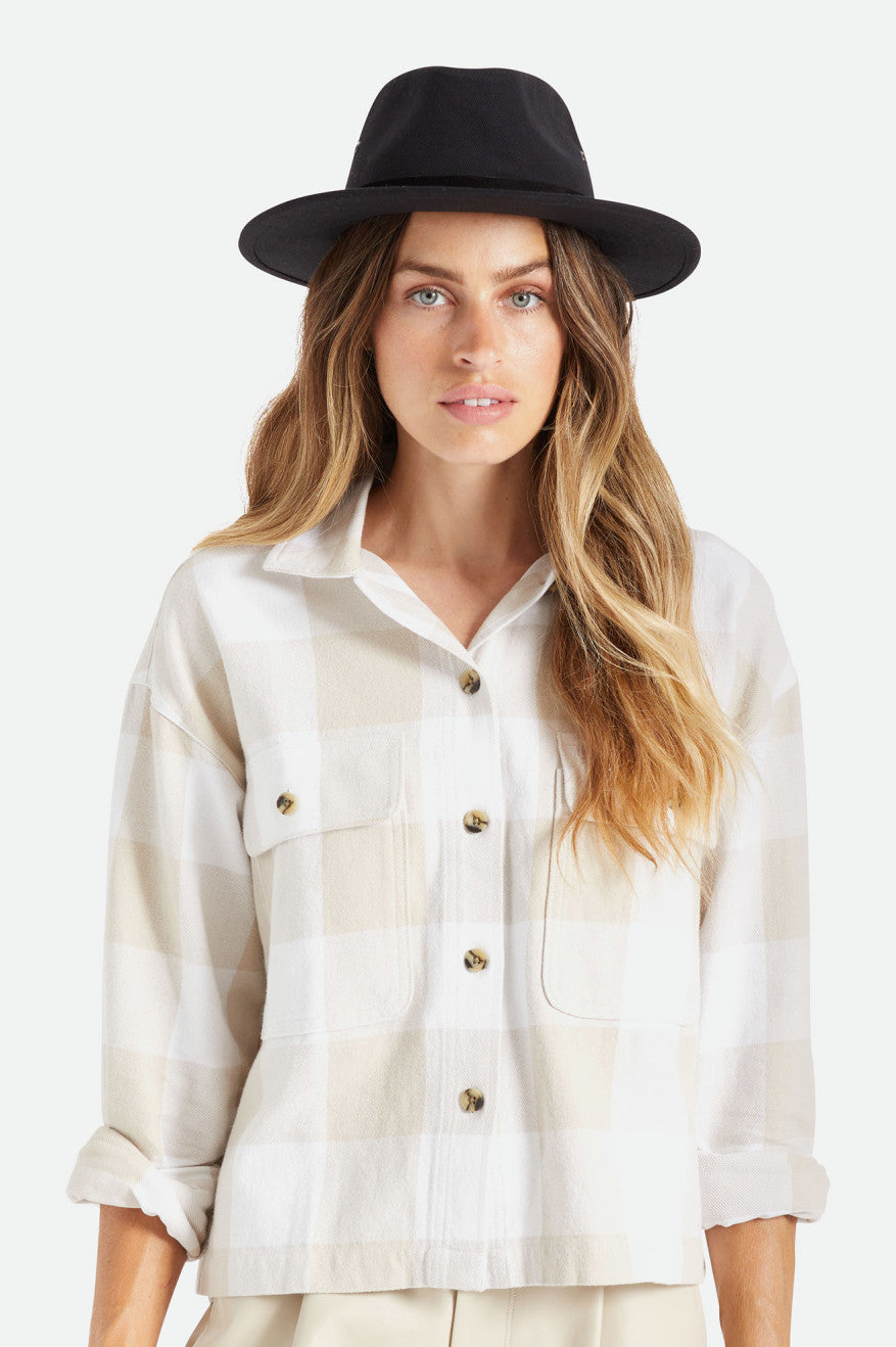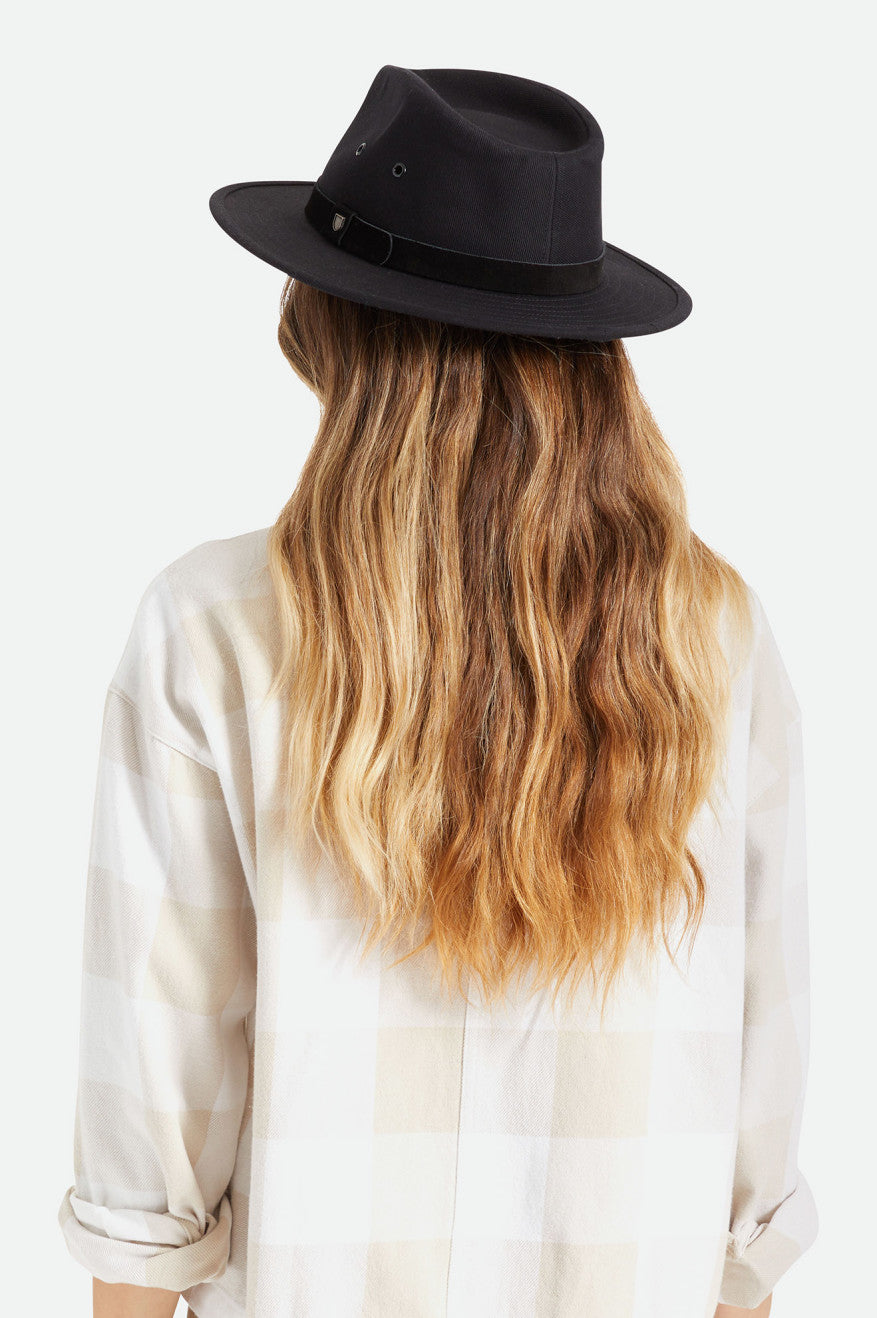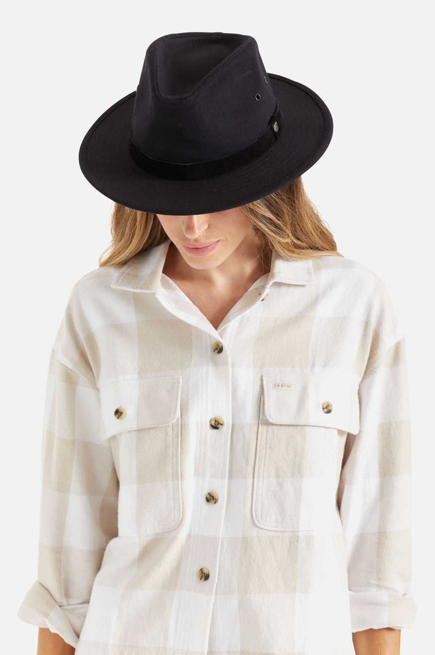 This version of our Messer Fedora is designed for travel and daily transit. Made with lightly structured cotton, it has an antimicrobial and moisture-wicking sweatband to keep you cool. Adjust your fit with the inner Velcro strap while rivets allow for extra airflow. Elevated with a 100% genuine suede leather band and a metal crest pin.