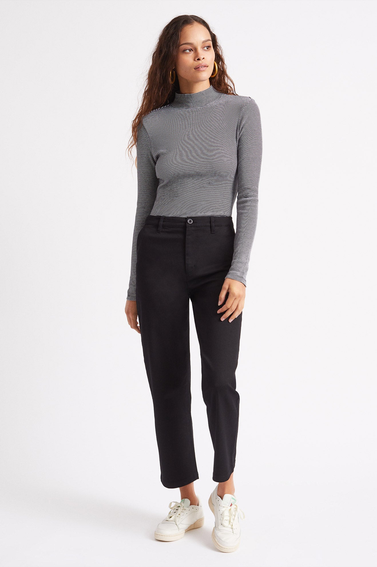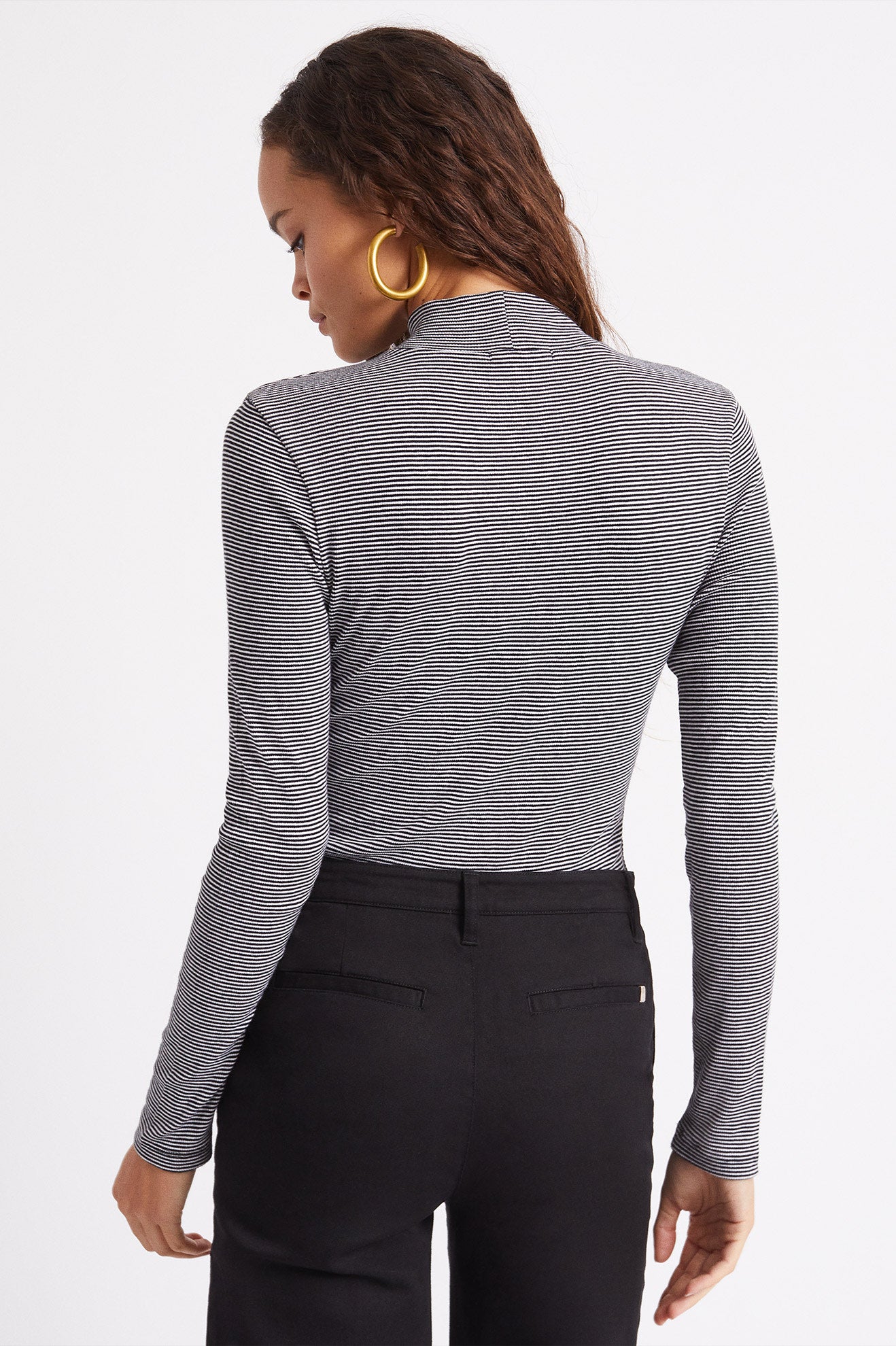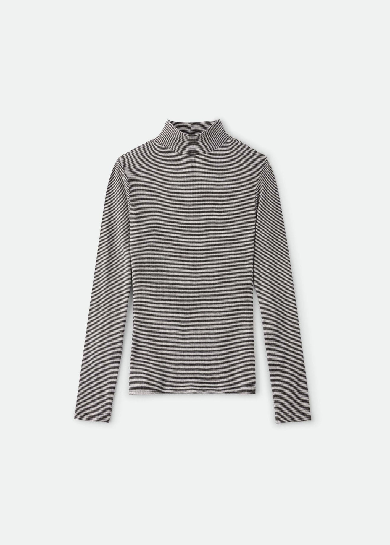 A slim fit turtleneck made of viscose and spandex rib, this top is comfortable and casual, but it also easily dresses up when you need it to. A go-to wardrobe staple for years to come.