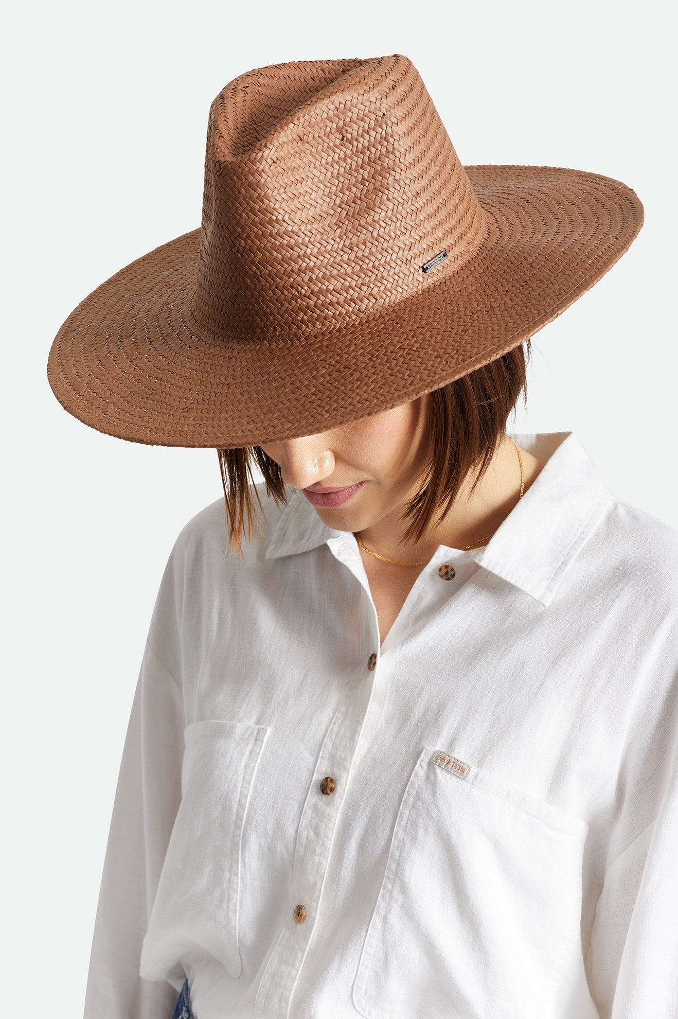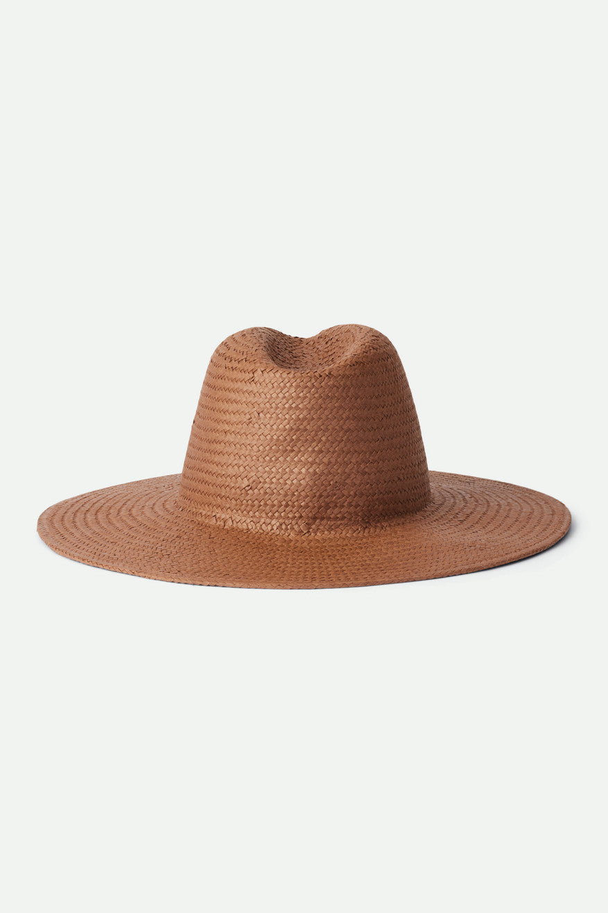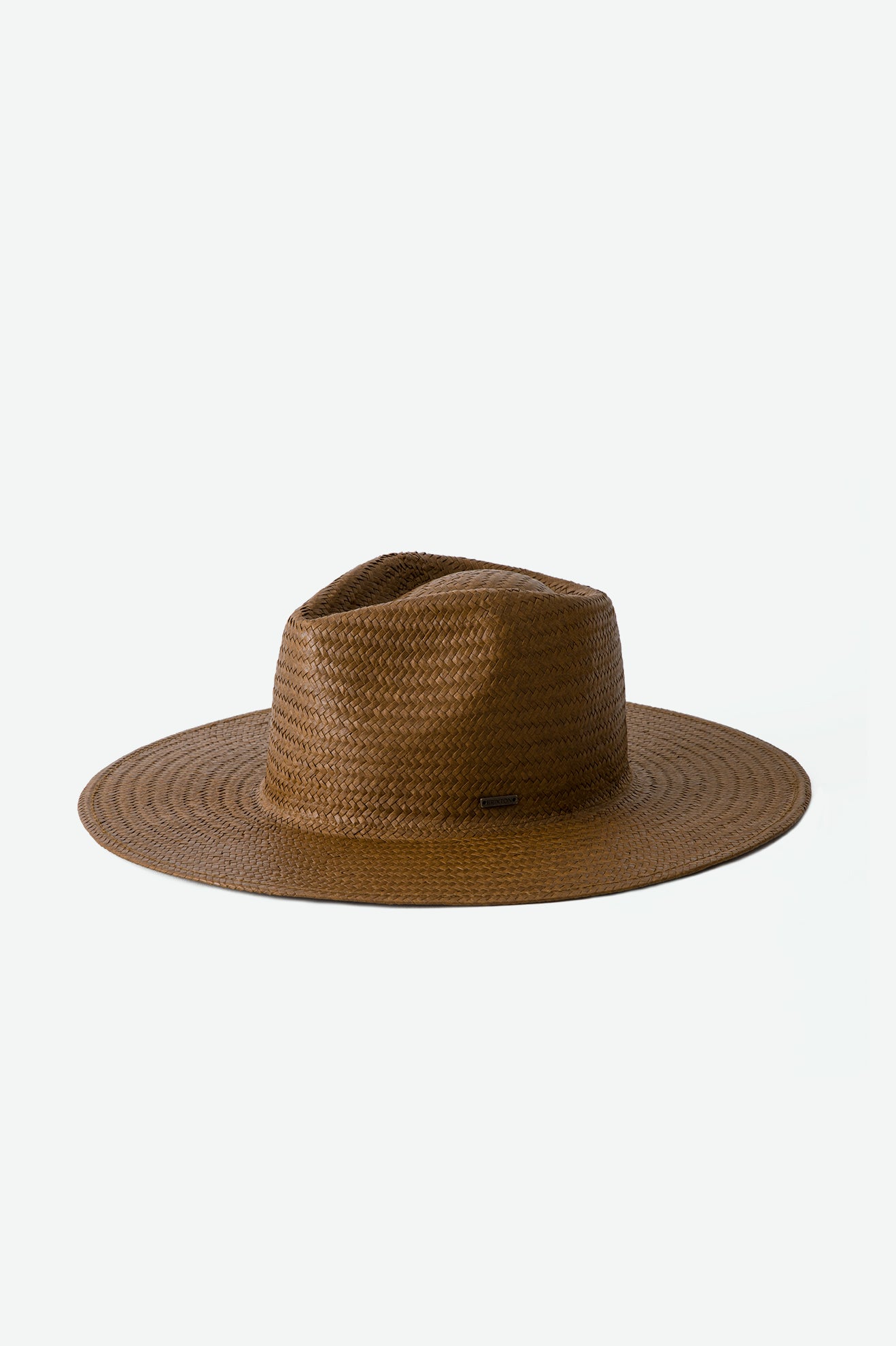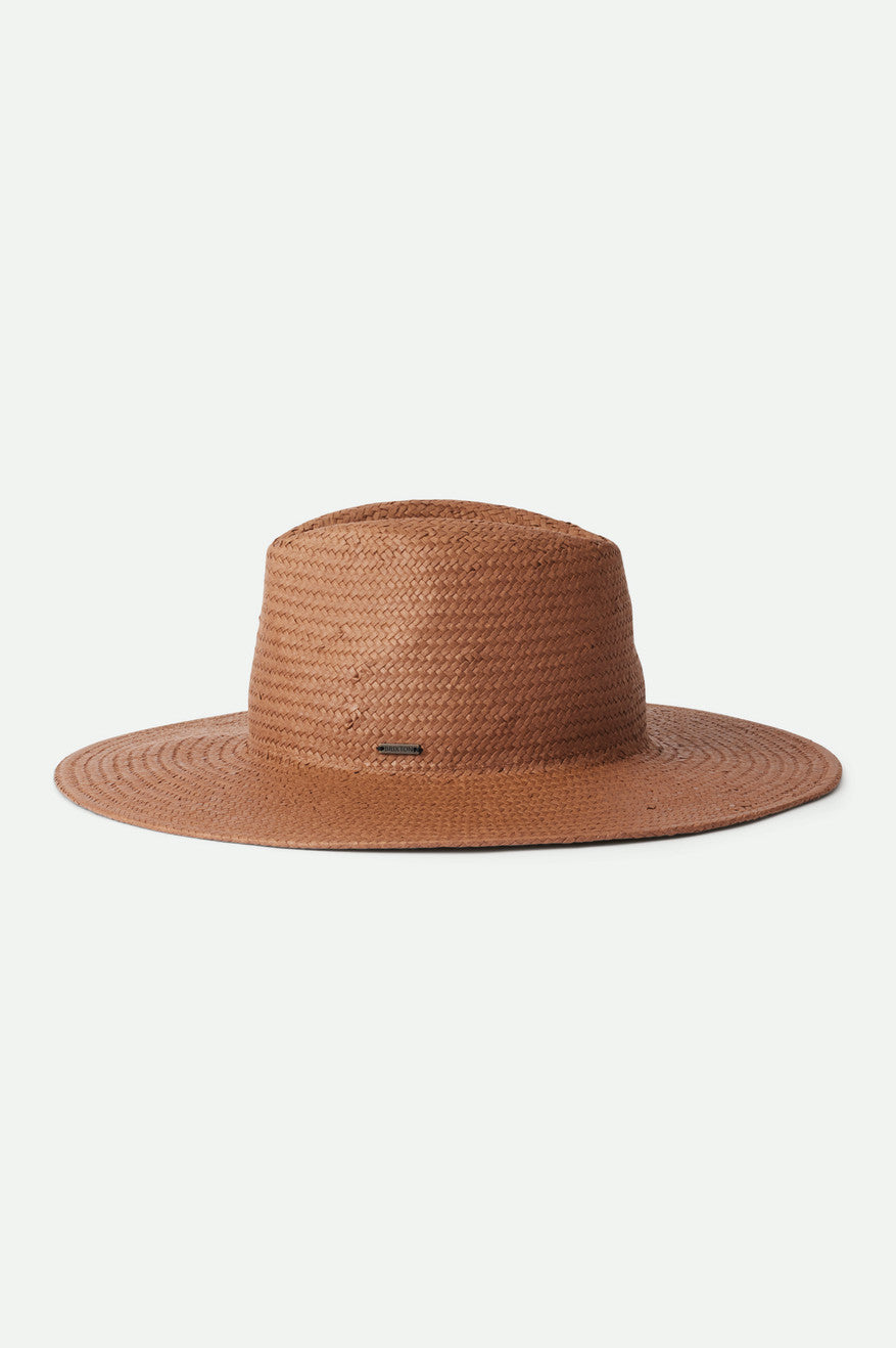 Salt, sand and the Seaside Sun Hat. This wide-brim hat has a clean silhouette with an elegant pinch and teardrop crease. Woven from paper straw, it provides 50+ UPF coverage in a lightweight package. Finished with a bronze metal headwear plaque.