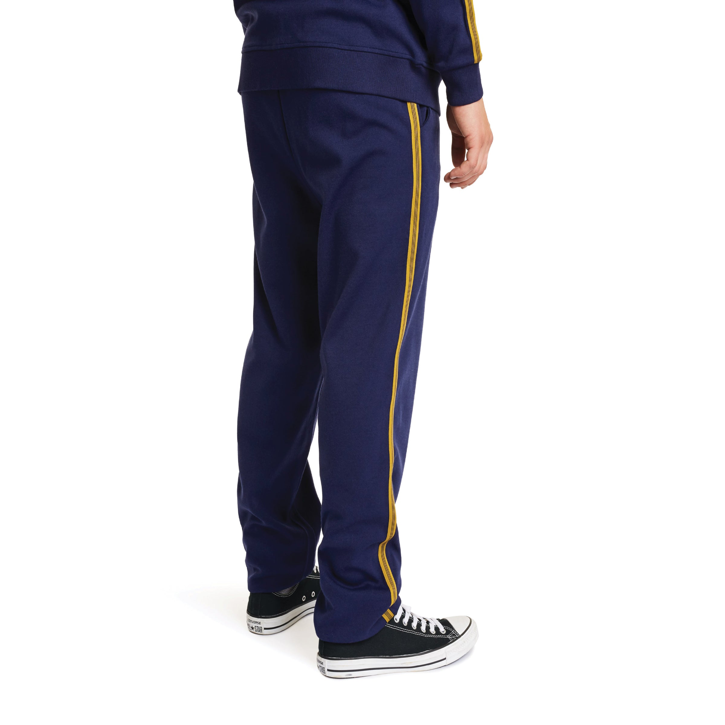 A casual tapered-leg sweatpant made in 260-gram poly/cotton brushed fleece. It features a drawcord adjustable elastic waistband, woven taping, and elastic leg hem.