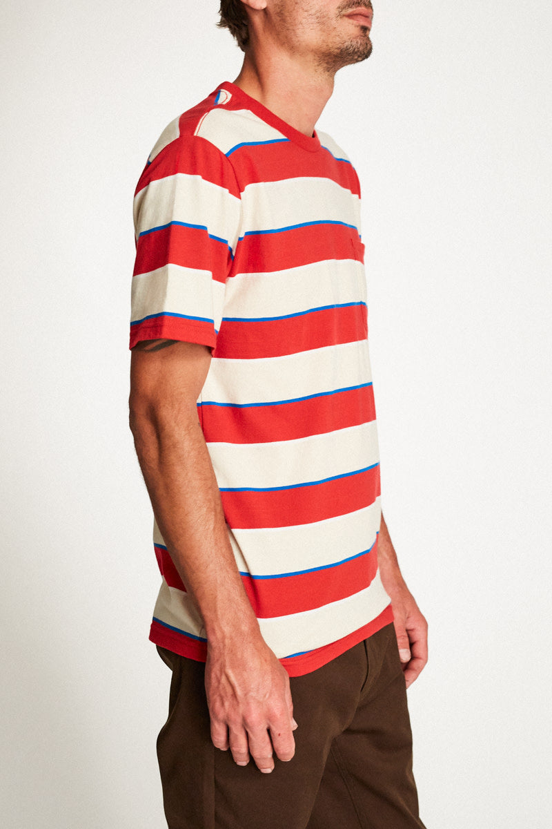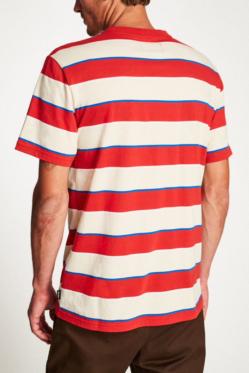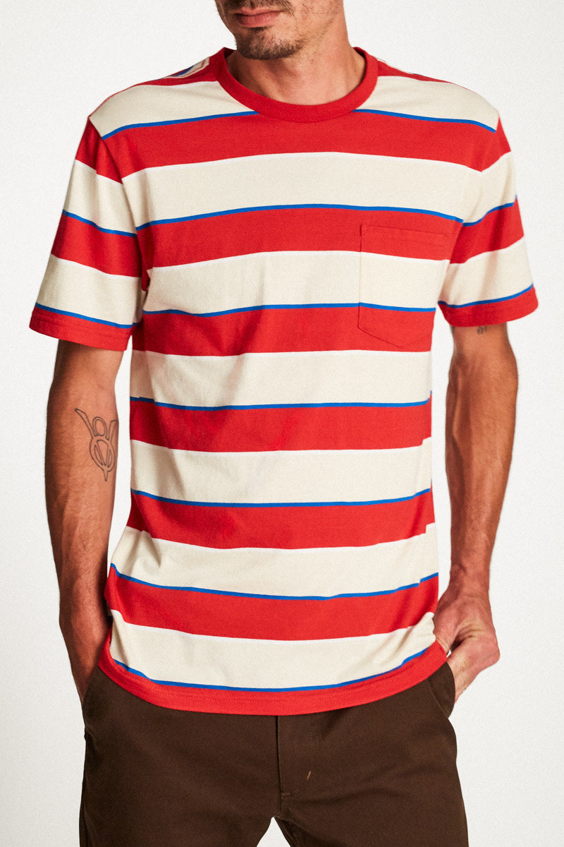 A 150-gram jersey short-sleeved knit top, featuring yarn-dyed stripes, our custom Worn Wash, and a woven Brixton label at left side seam.
