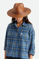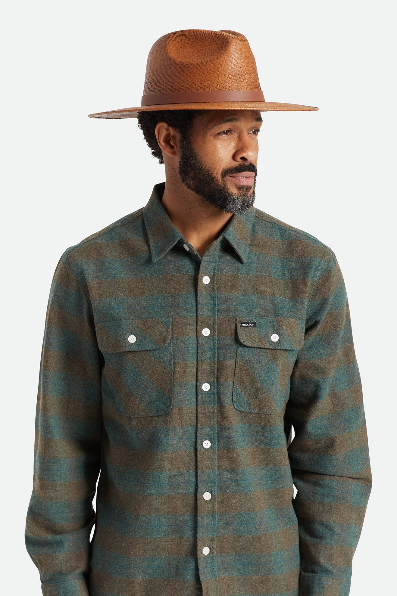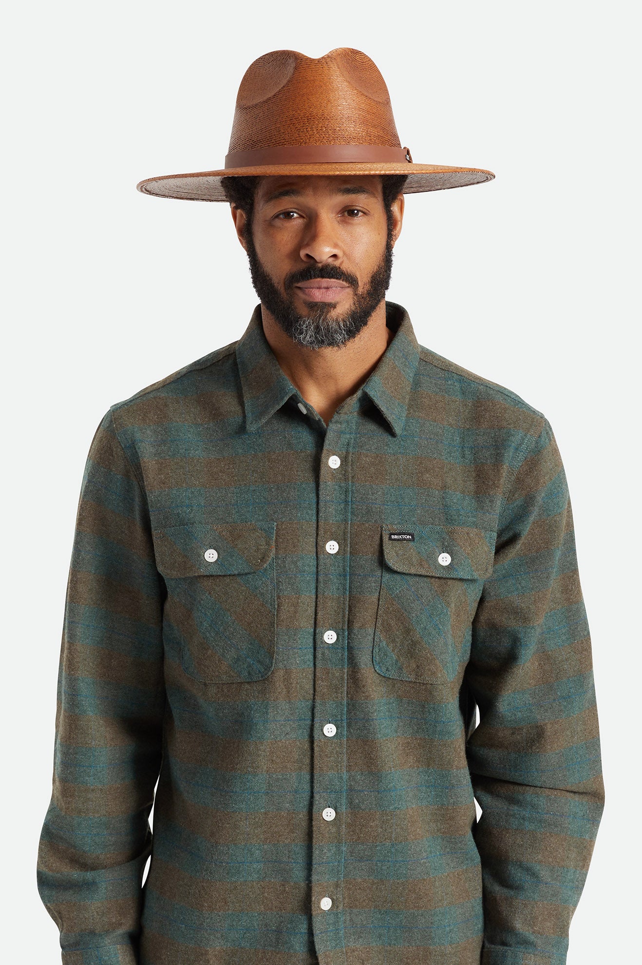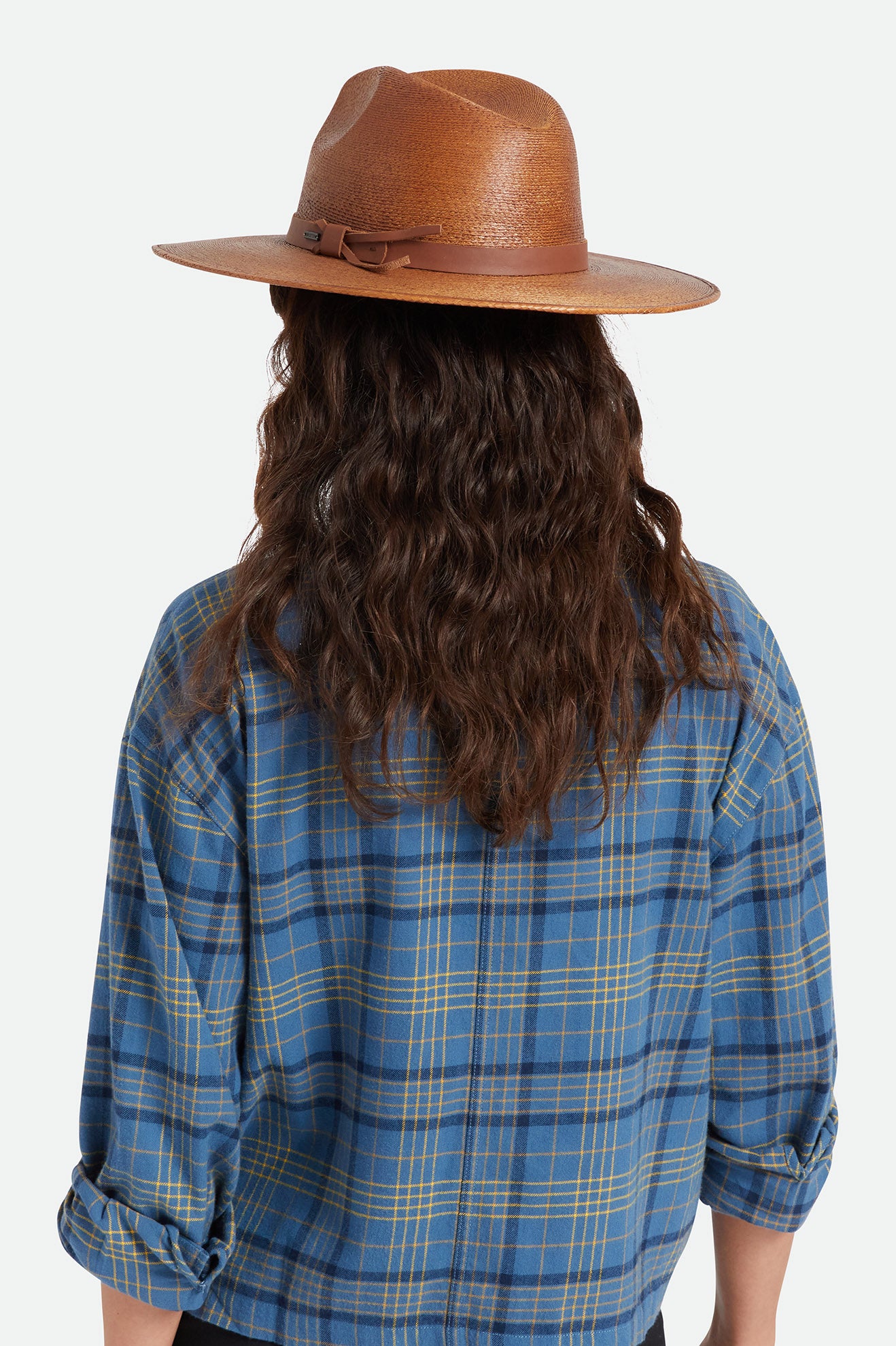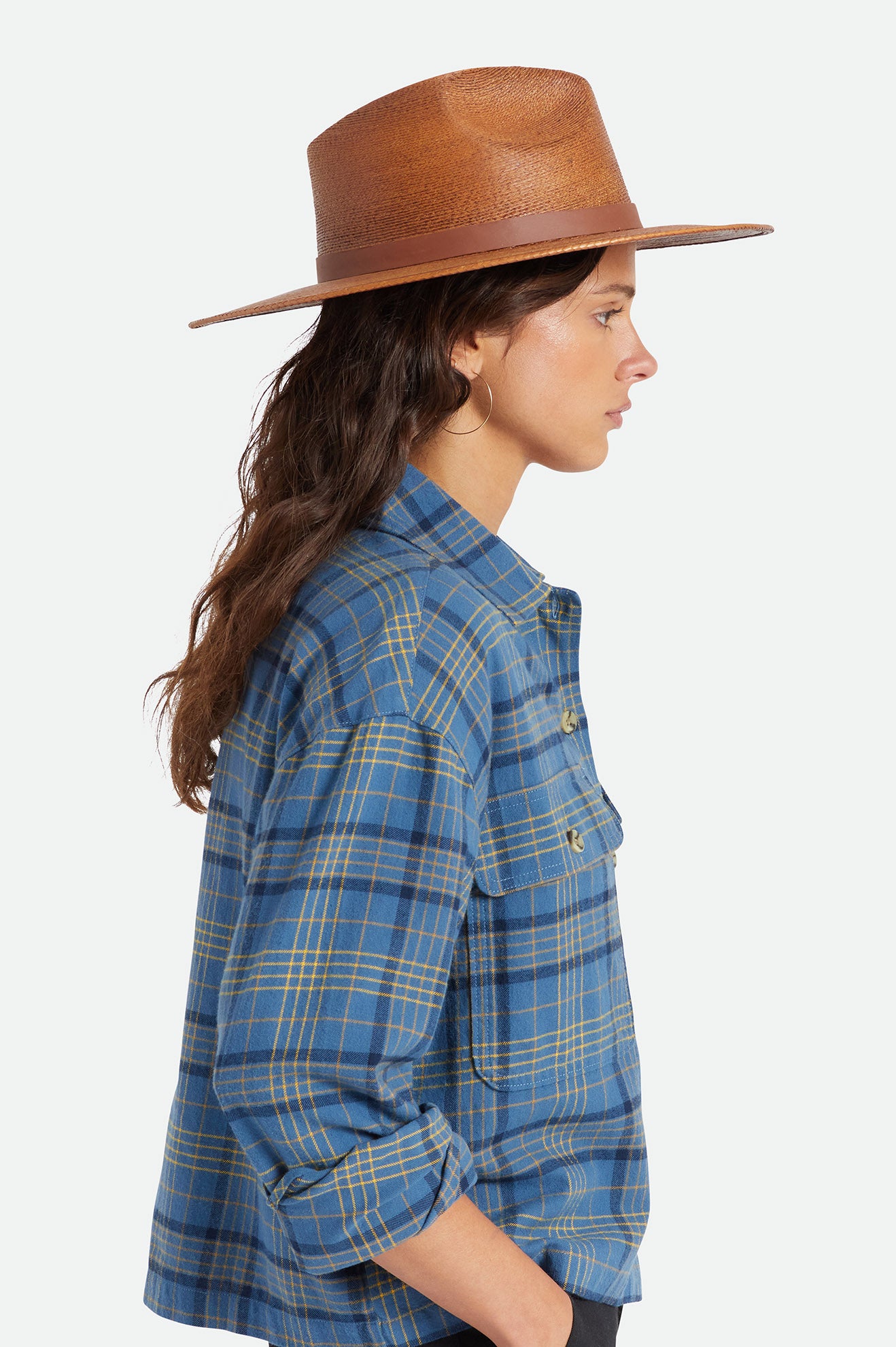A reincarnation of one of our favourite silhouettes, this Western-inspired hat has a smooth pinch and strong center crease. This version is made from fine Tripilla straw that provides 50+ UPF coverage. It's finished with luxurious details like a genuine leather band and metal plaque.
