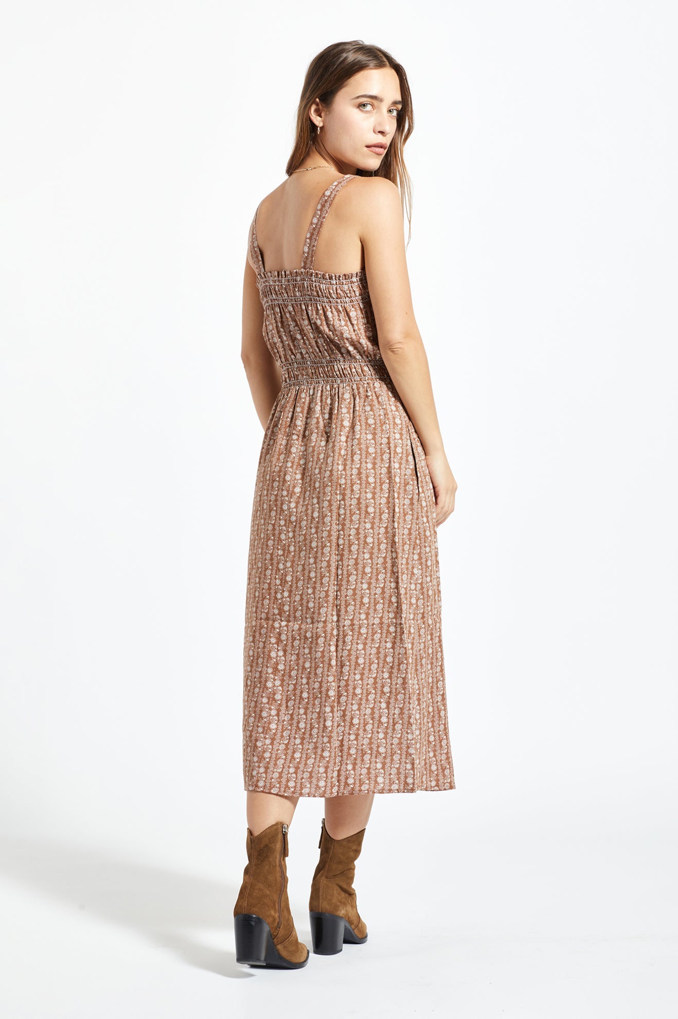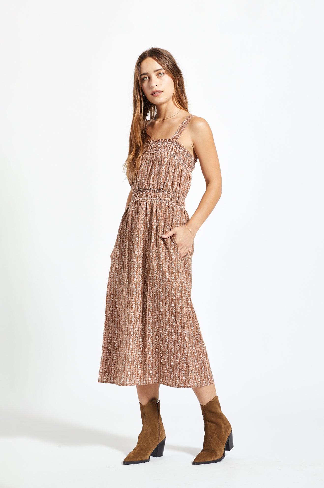 The Balboa Linen Dress is a toss-on and head-out dress with simple sophistication. It’s designed with a Western-inspired floral print and has a smocked bodice for added stretch and comfort. Finished with side pockets and a midi-length skirt.
