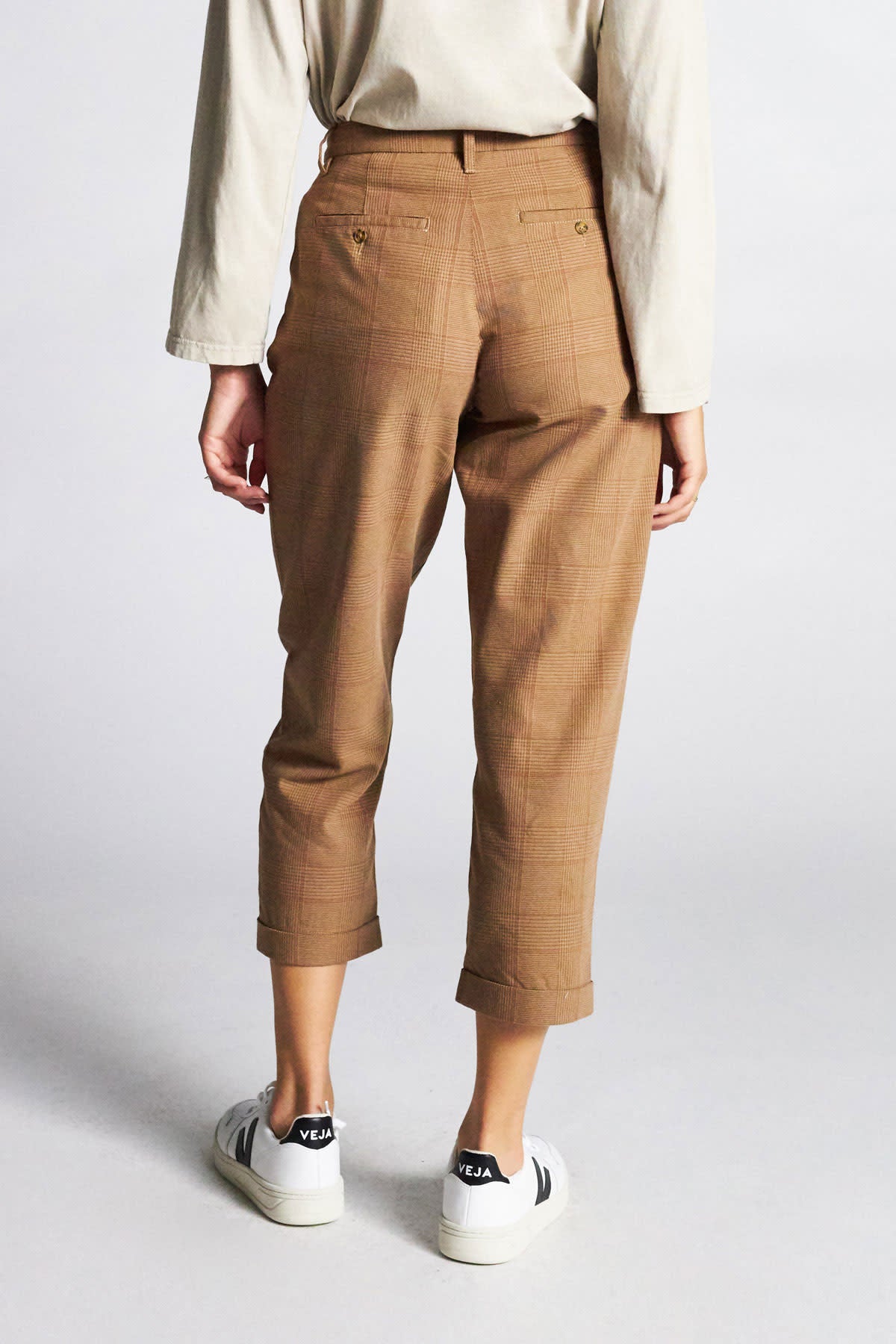 A high-rise, straight-leg pleated trouser pant made in 6-oz. cotton/polyester yarn-dyed plaid. It features front slash pockets, tailored interior waistband, rolled cuff, woven Brixton labels, a 14" leg opening, and a 24" inseam.