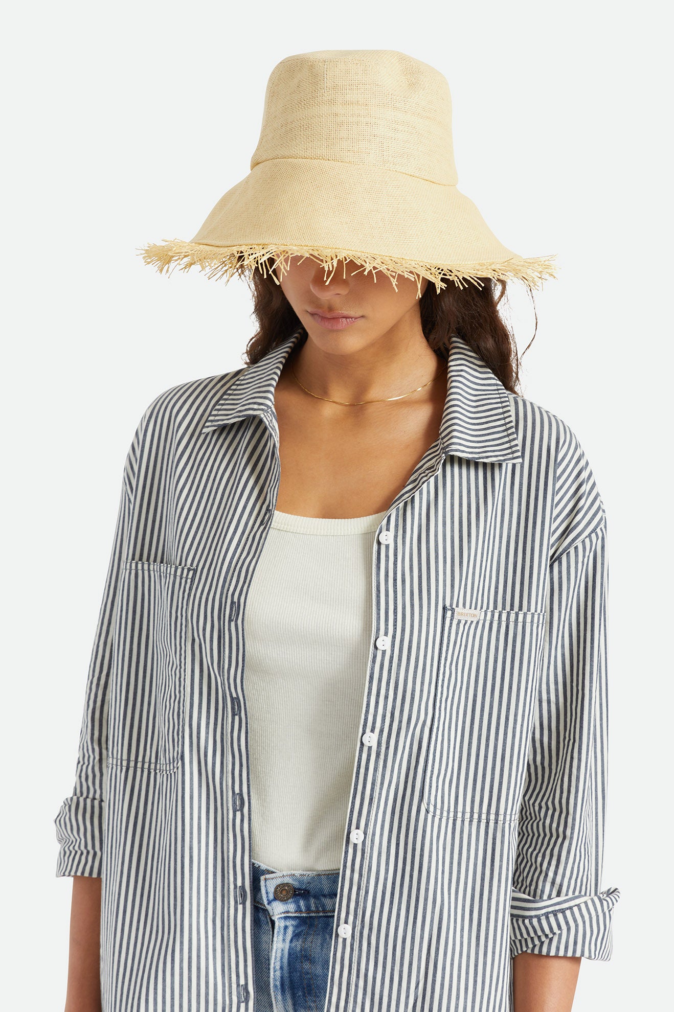 The Alice Straw Bucket Hat is a circular raw-edge hat crafted from 100% straw. An essential for your beach bag and vacay packing list, it provides 50+ UPF coverage.