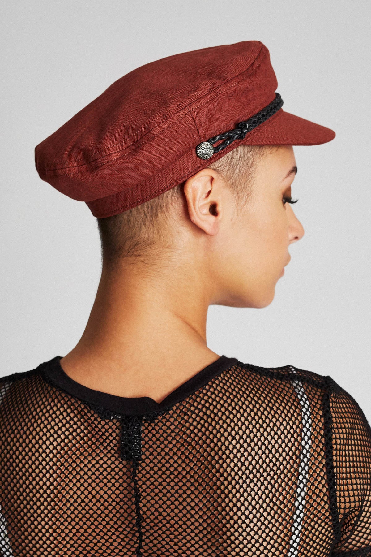 The Ashland Cap is a fisherman cap designed with mixed fabric and featuring both a genuine leather braided band and a metal logo pin.