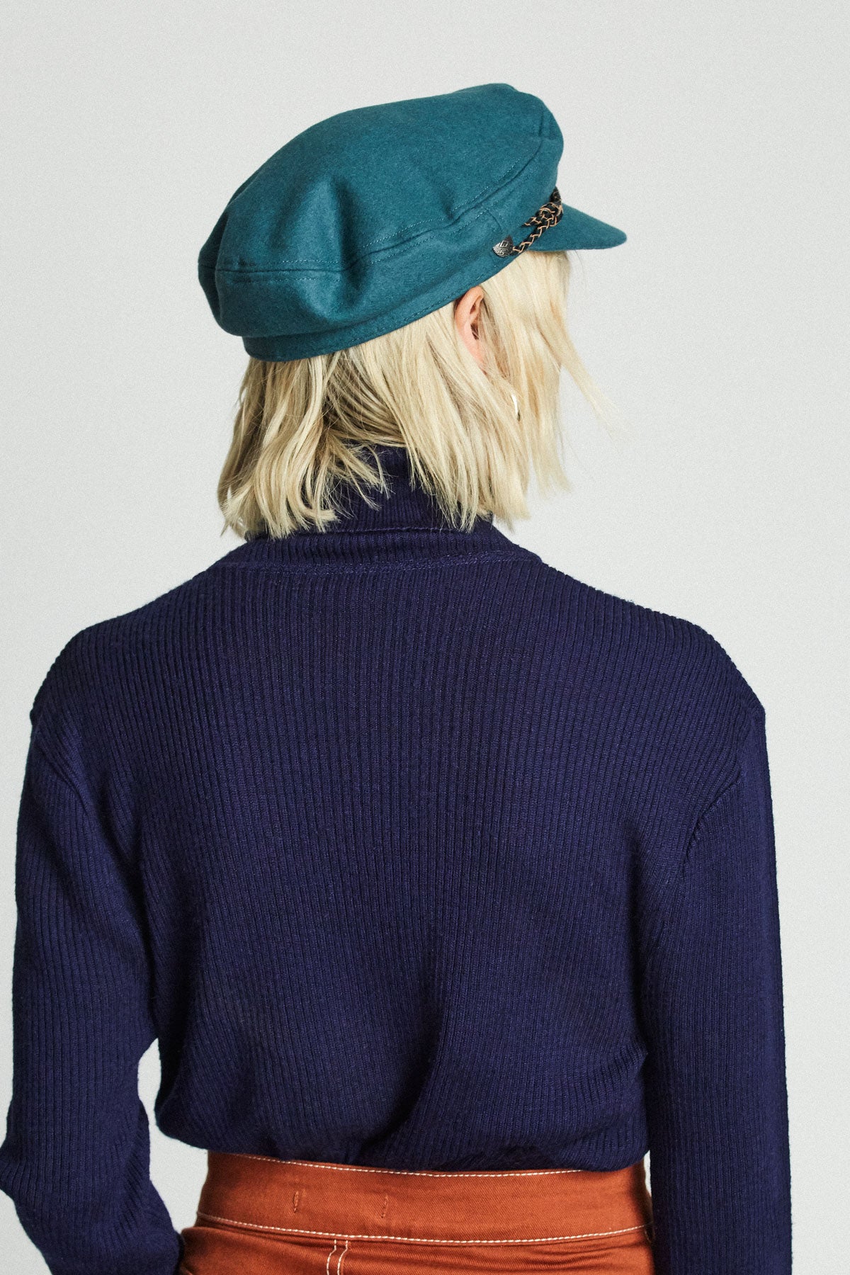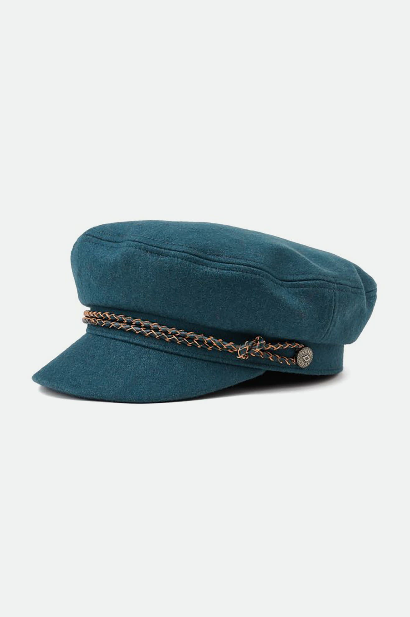 The Ashland Cap is a fisherman cap designed with mixed fabric and featuring both a genuine leather braided band and a metal logo pin.