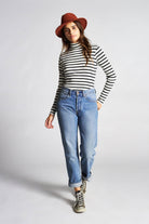 It features a tall neck funnel that can be rolled down or kept high, fitted body and sleeves, and woven Brixton labels.