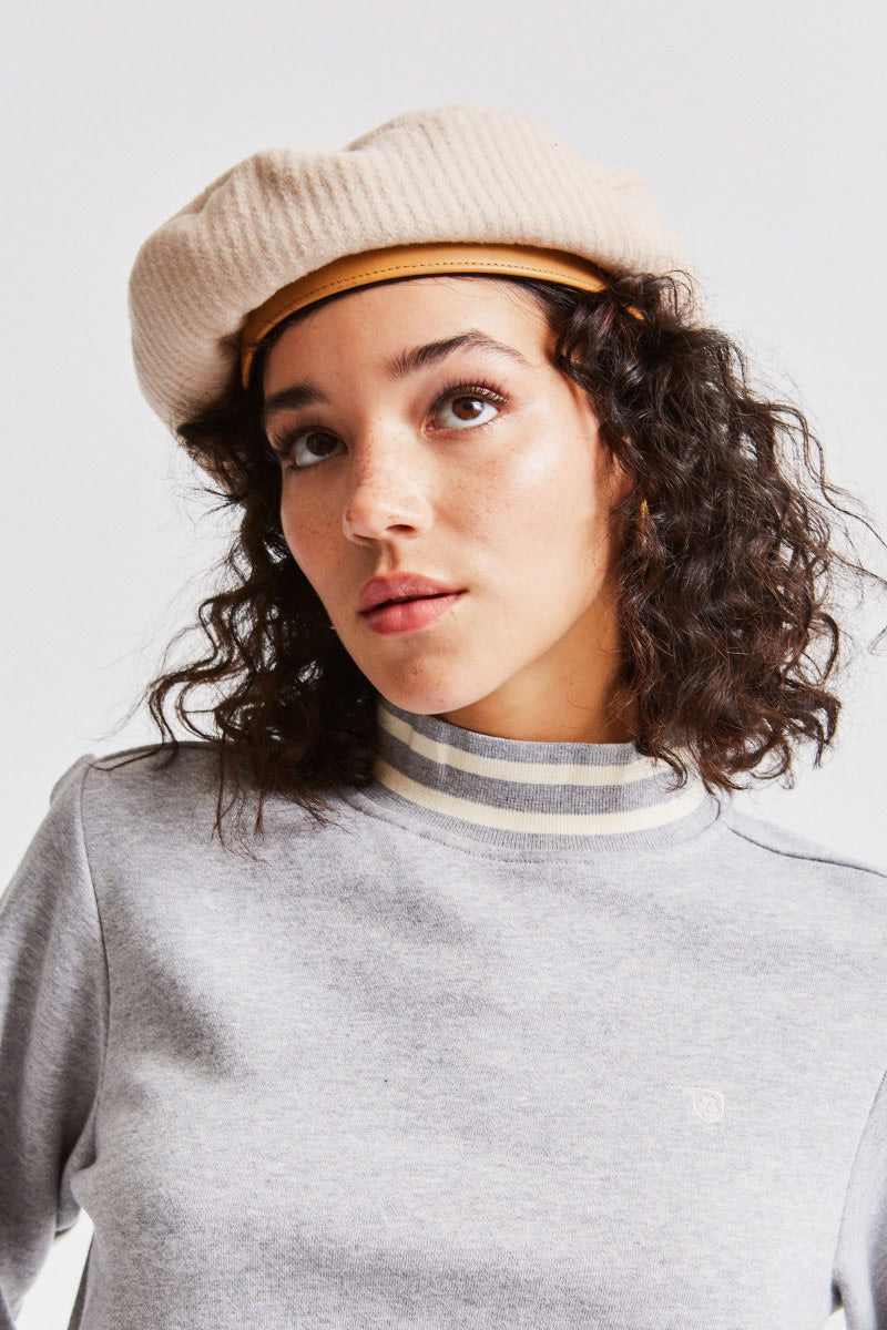The Brixton Audrey II Beret is a custom beret hat in mixed fabric featuring leather crown trim with a metal Brixton B-shield.