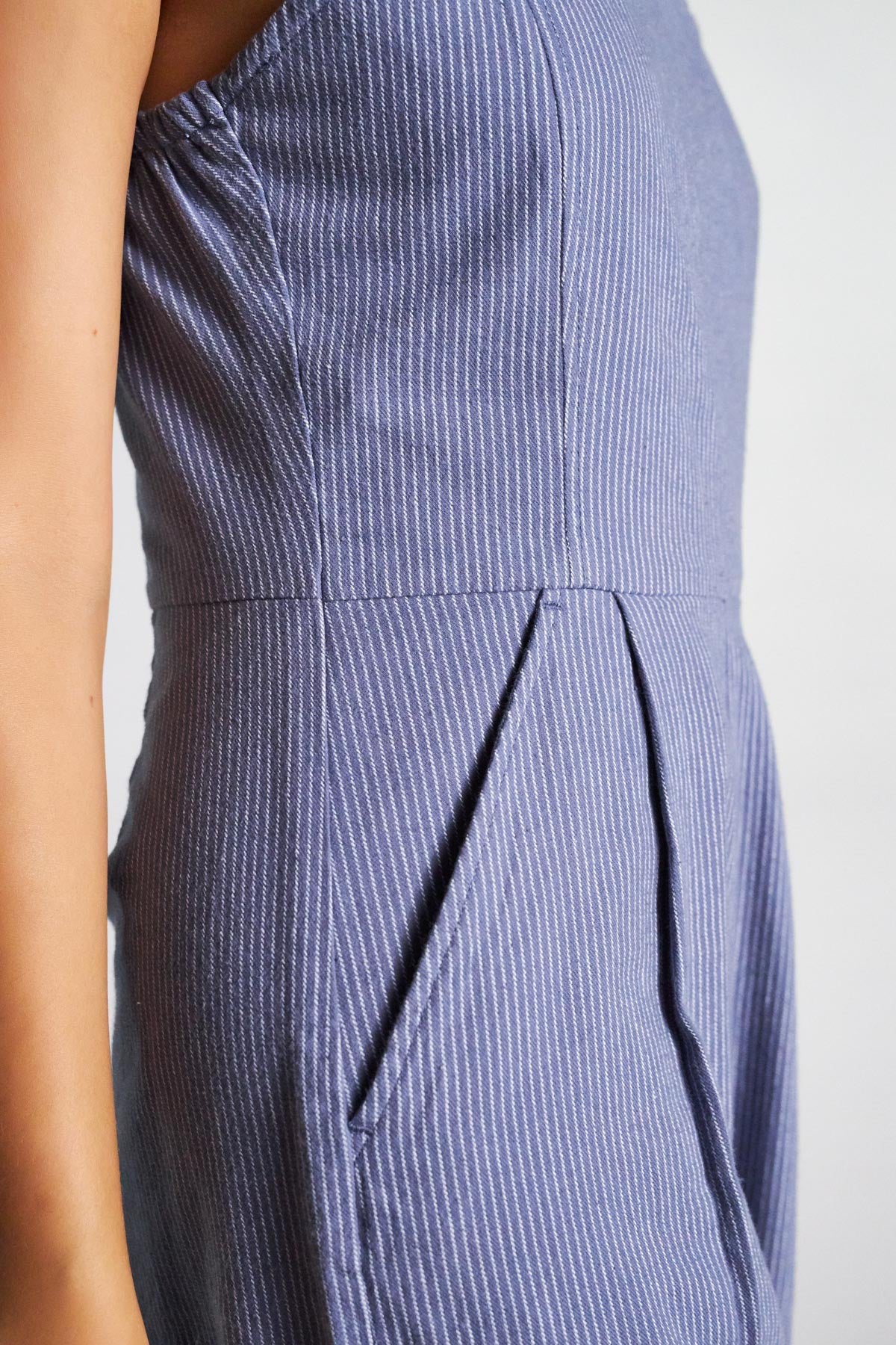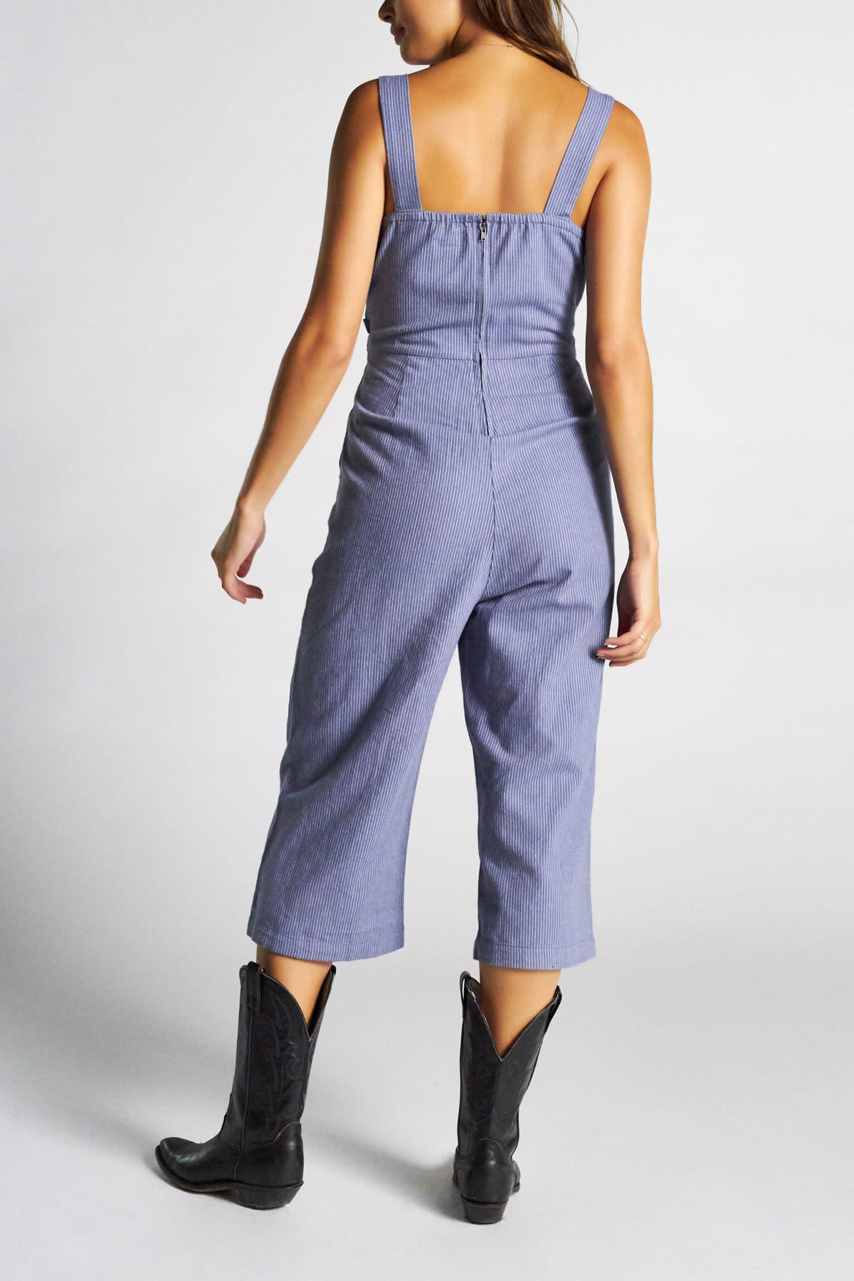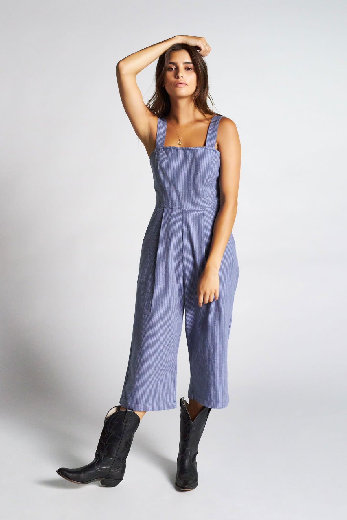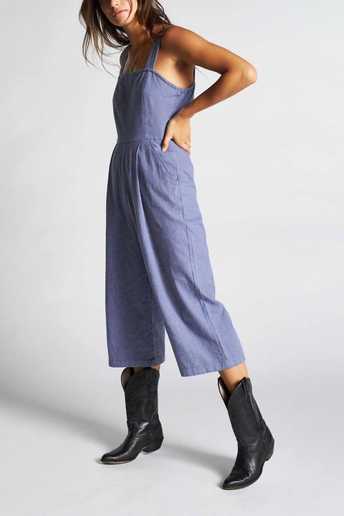 A fitted wide-leg jumpsuit made in 5-oz. 100% cotton yarn-dyed twill. It features front slash pockets, pleat detail at waistband, extra wide straps, woven Brixton labels, and a 22" leg opening.