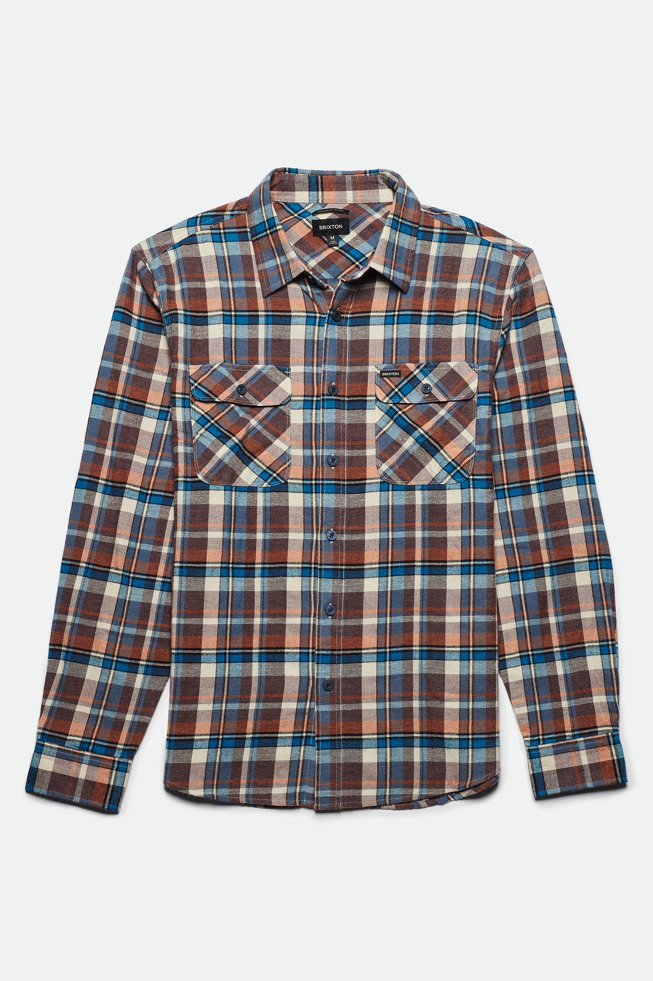 It features two chest pockets, a standard shirttail hem, adjustable sleeve cuffs, and a woven Brixton label at pocket.