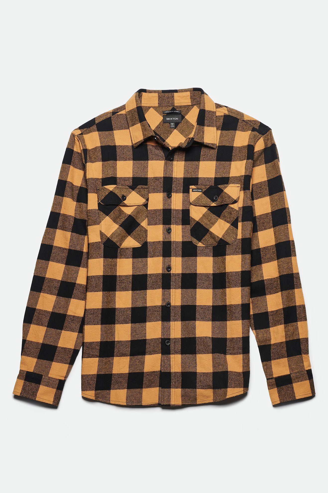 It features two chest pockets, a standard shirttail hem, adjustable sleeve cuffs, and a woven Brixton label at pocket.