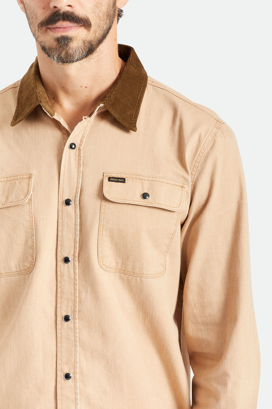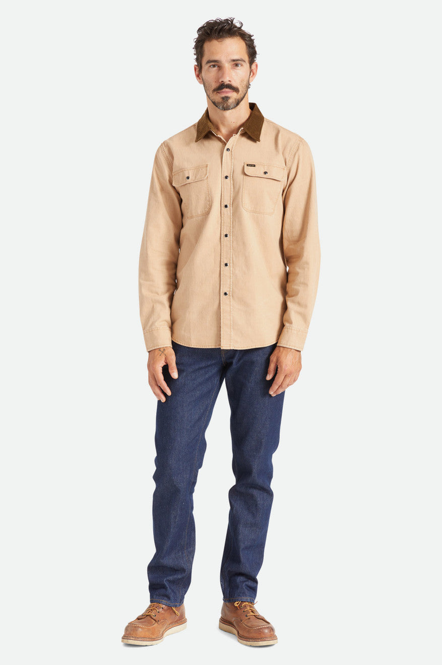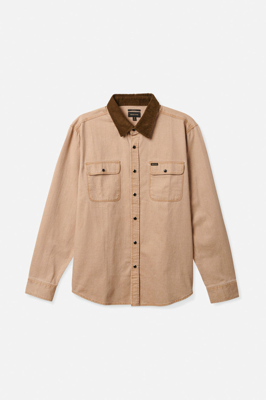 A fresh take on a Brixton staple, the Bowery Reserve L/S Woven adopts Western-inspired influences for understated style. Opting for a seamless yoke, it keeps the dual chest pockets of the classic Bowery but swaps out the front buttons for pearl ring snaps. Elbow patches and a corduroy collar add durability in high-wear areas and the entire garment has been treated with a softener wash for that favorite-shirt feel.