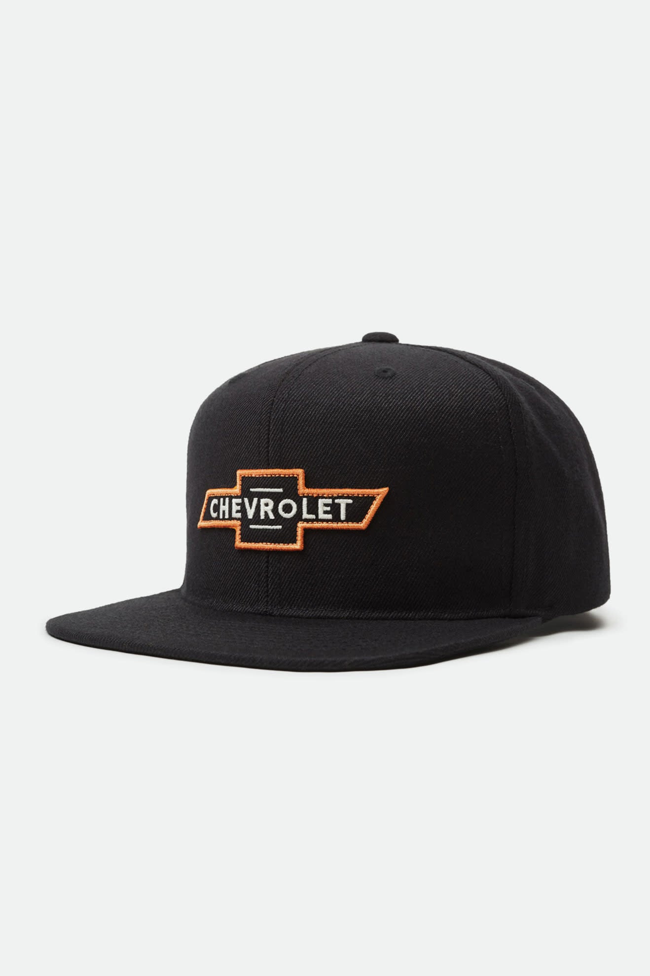 The men's unisex, Brixton Chevy Bowtie MP Snapback is a six-panel cut-and-sew acrylic wool snapback featuring a merrowed edge embroidered patch and a plastic snap. Color: Bel Air Black.