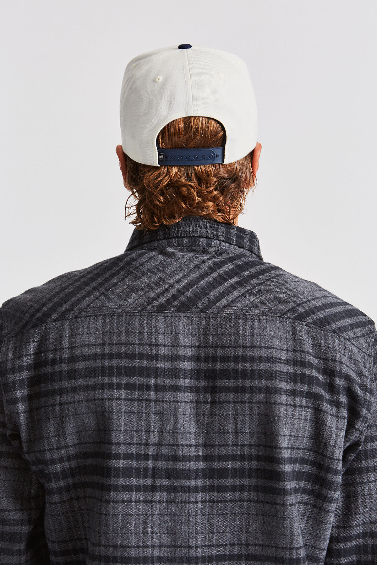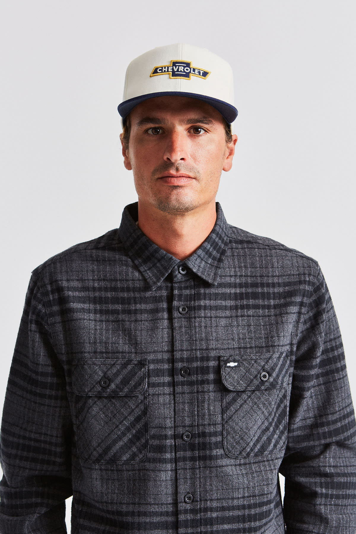 The men's unisex, Brixton Chevy Bowtie MP Snapback is a six-panel cut-and-sew acrylic wool snapback featuring a merrowed edge embroidered patch and a plastic snap. Color: El Camino White.