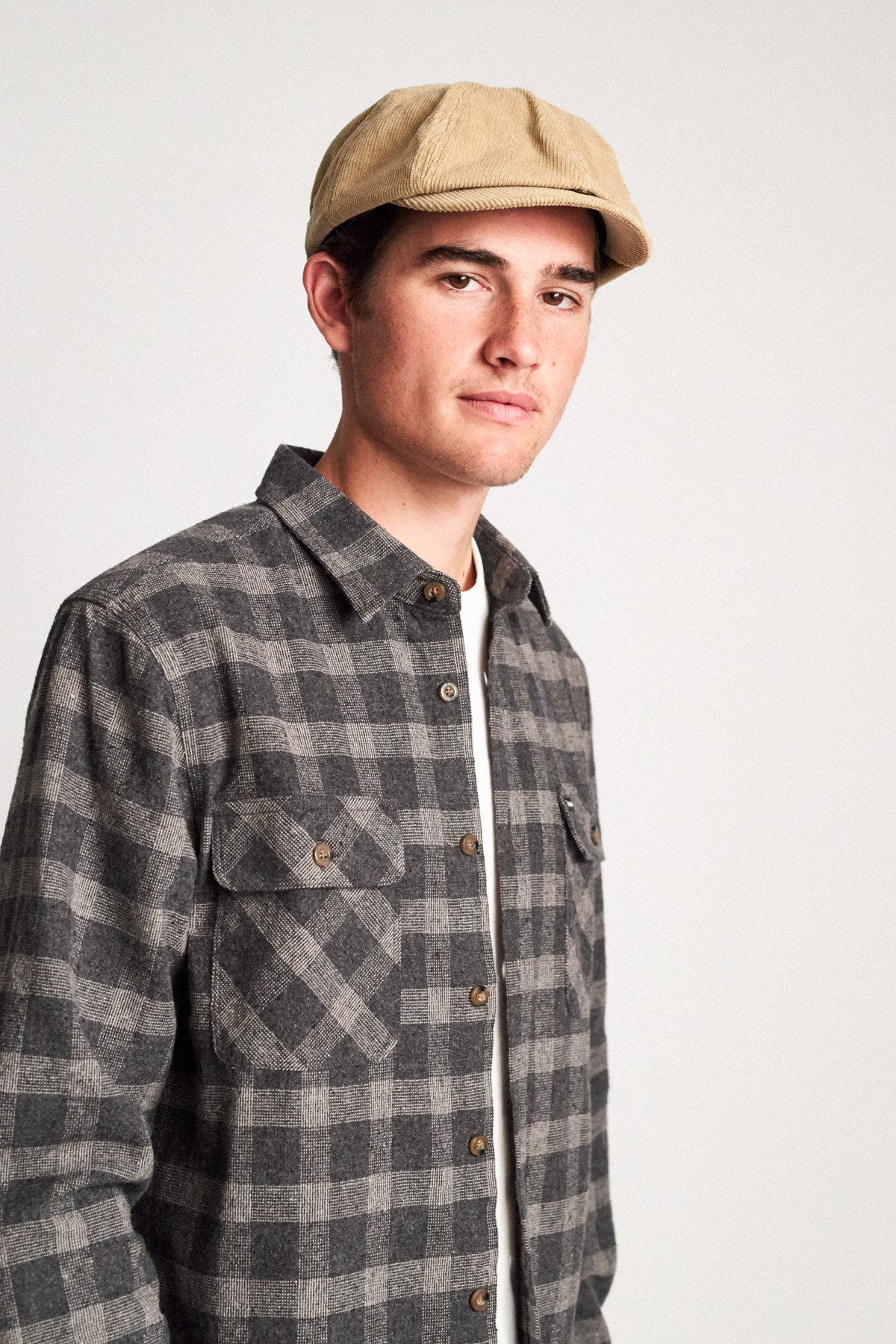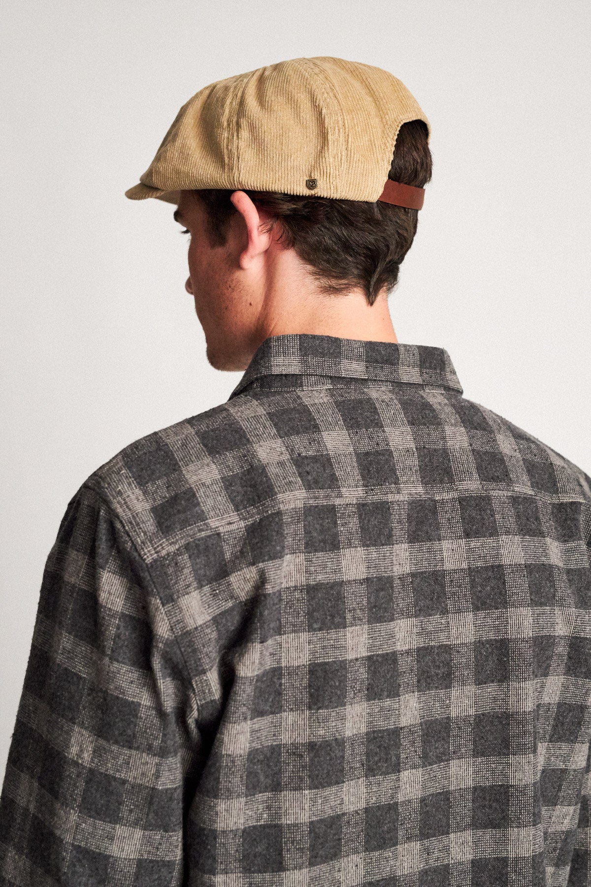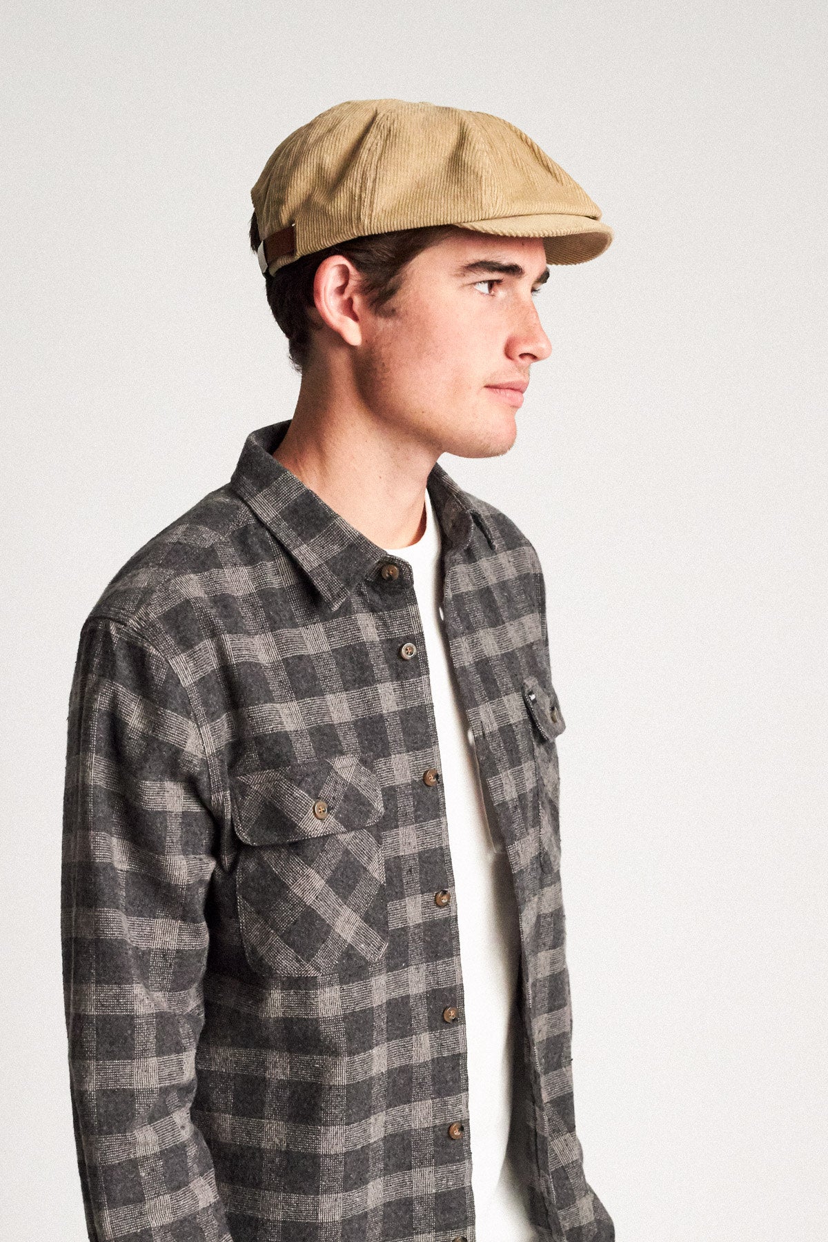 A unisex eight-panel cut-and-sew snap cap with adjustable strap and a metal Brixton B-shield. Color: Light Khaki.