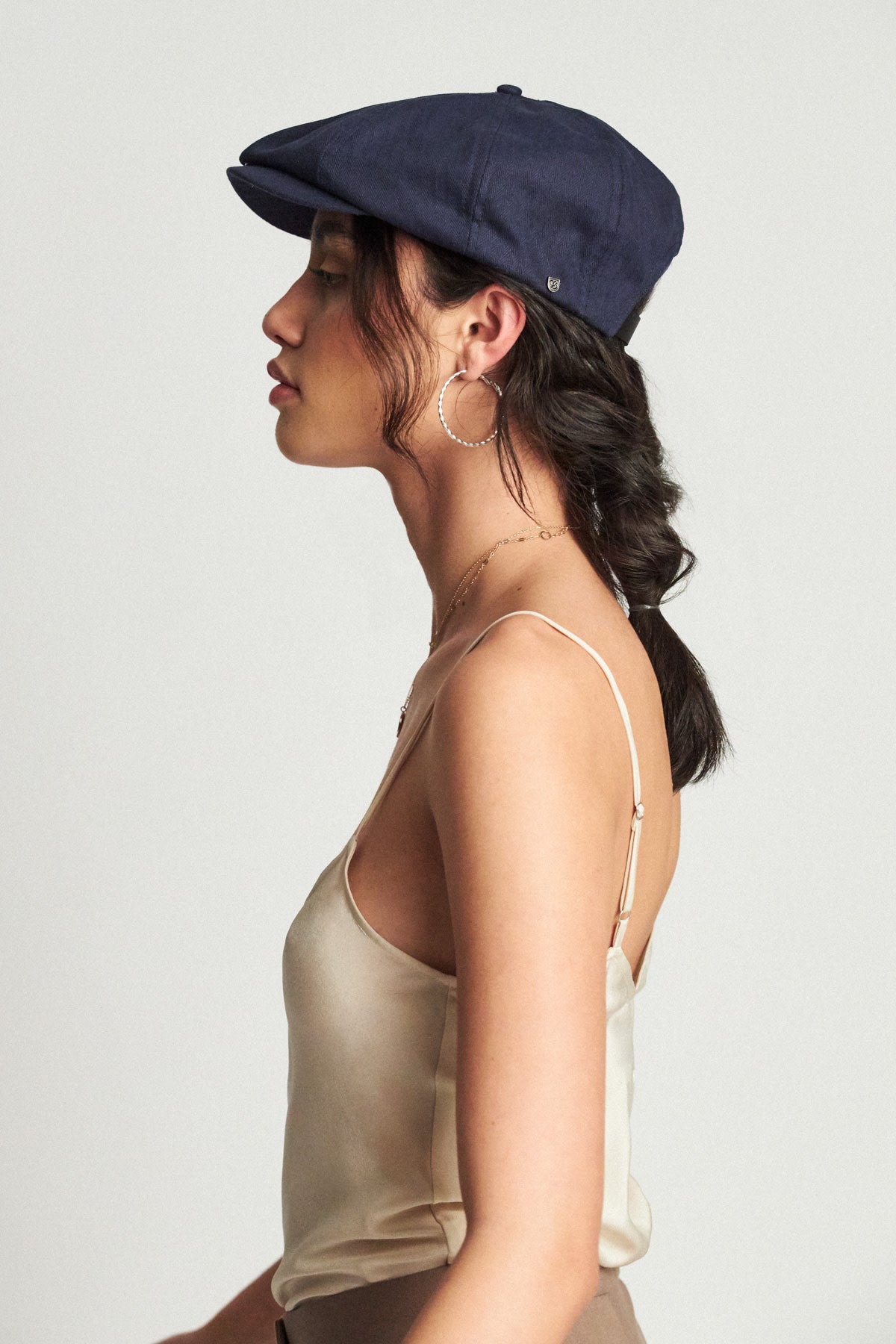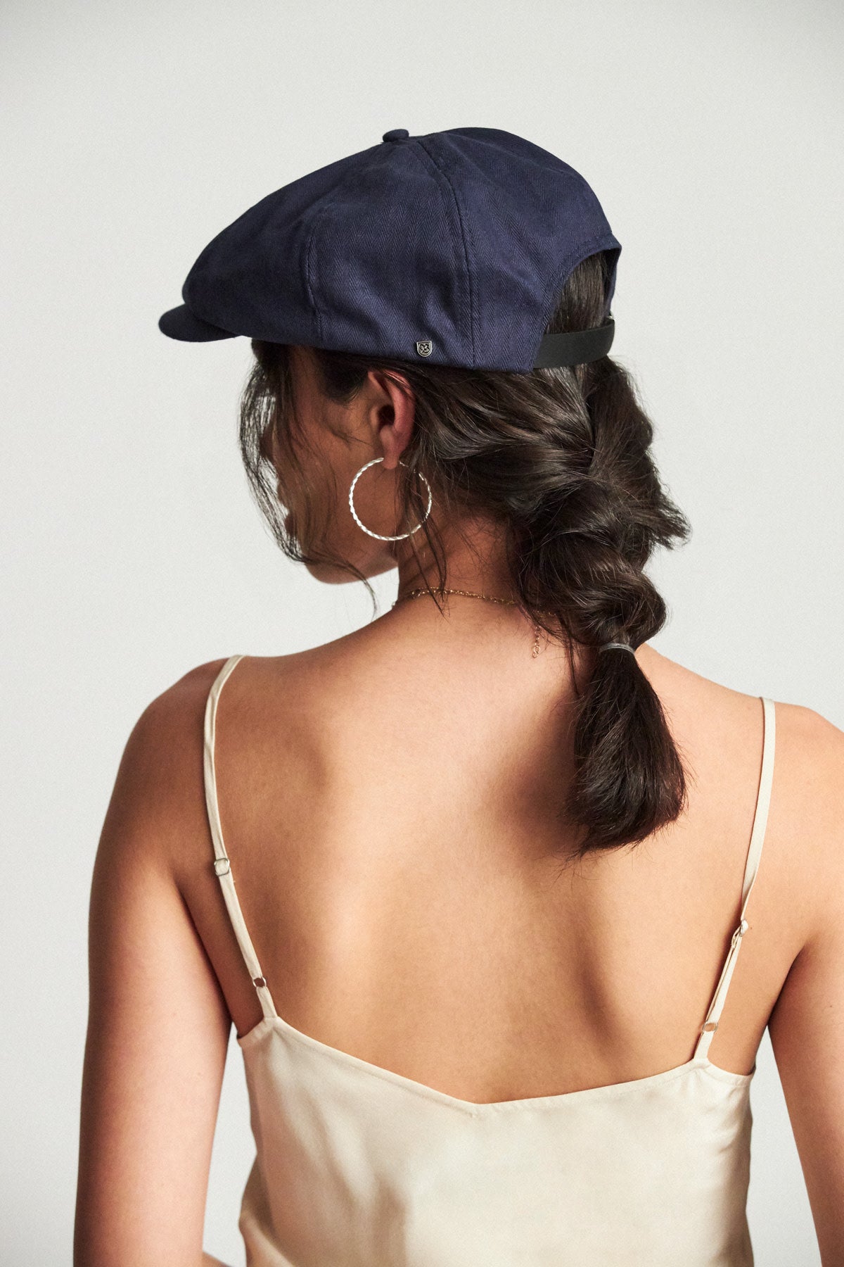 A unisex eight-panel cut-and-sew snap cap with adjustable strap and a metal Brixton B-shield. Color: Washed Navy.
