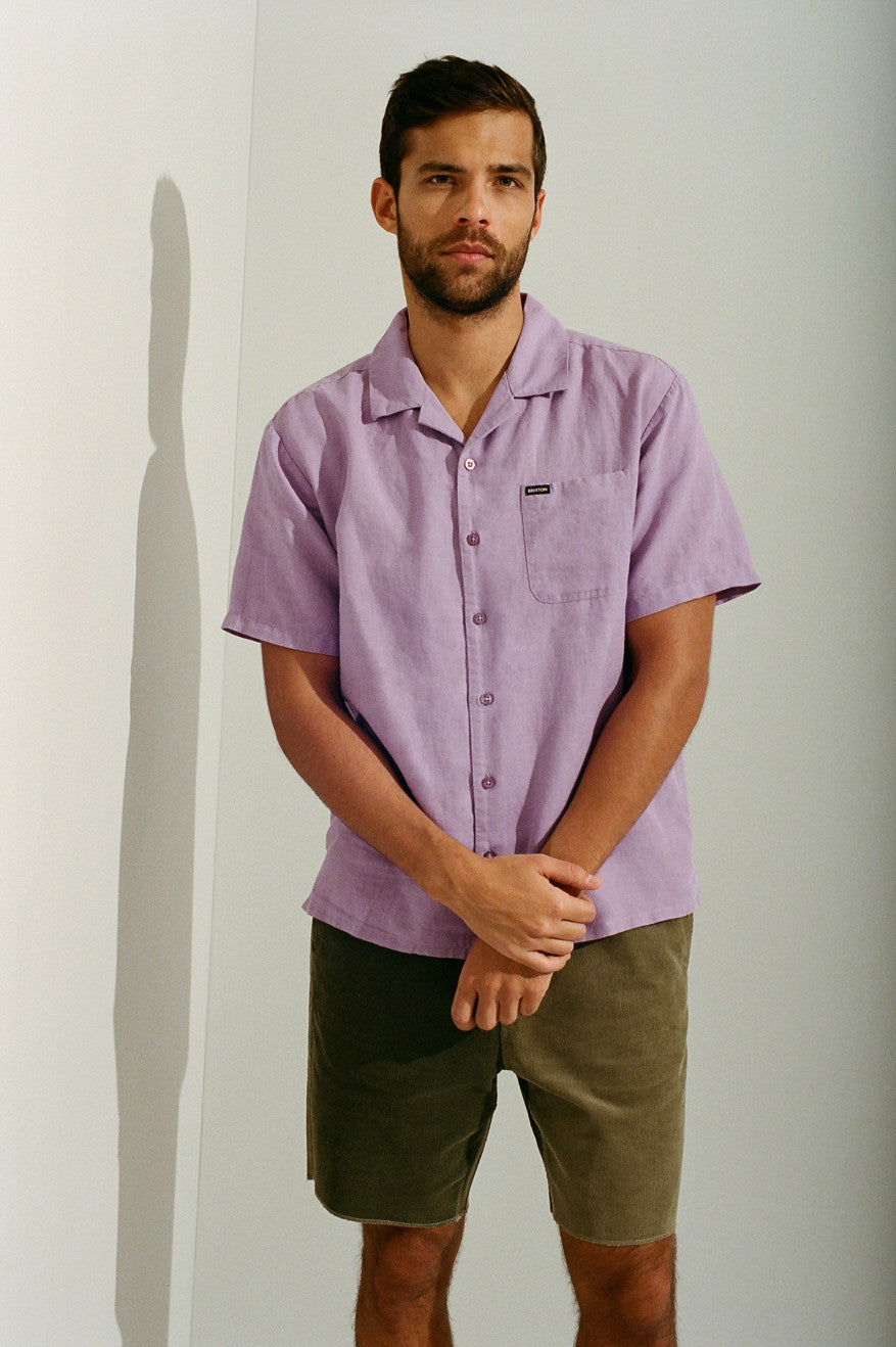 The Bunker is a short-sleeve button-up woven in a breathable linen blend. It has a relaxed fit, straight hem and side vents for mobility. A casual camp collar makes this piece ideal for sitting, sipping and staycations.
