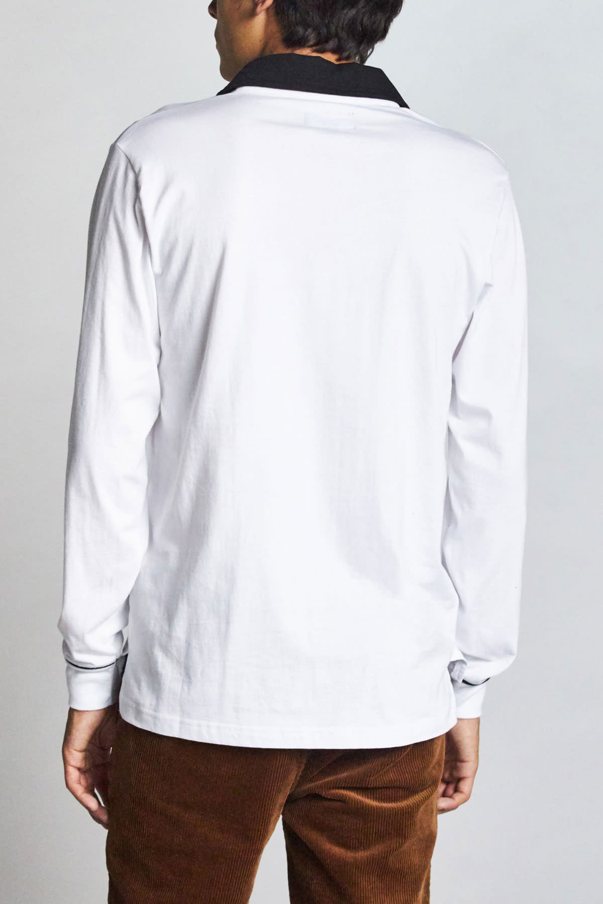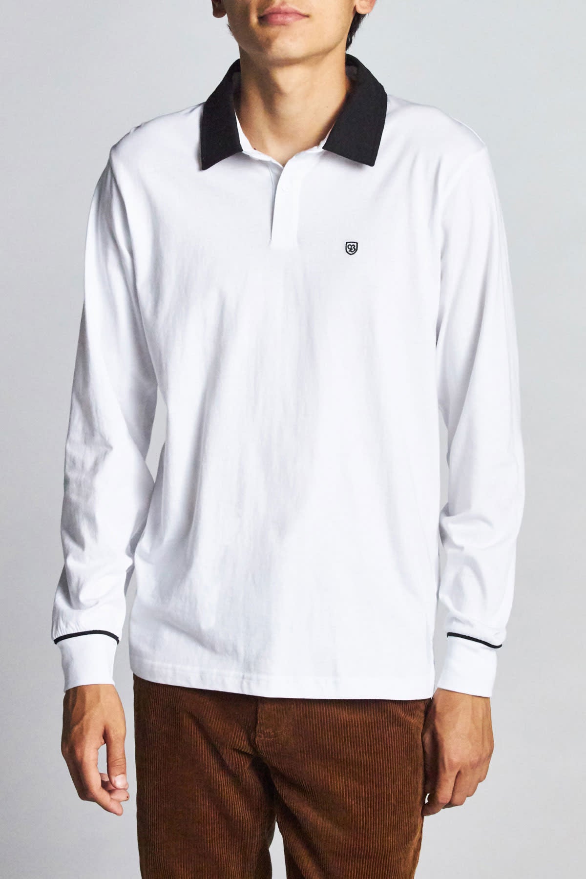A 185-gram long-sleeved polo knit top. It features ribbing and piping at sleeves, a two-button placket, and custom Brixton B-shield embroidery at left chest.