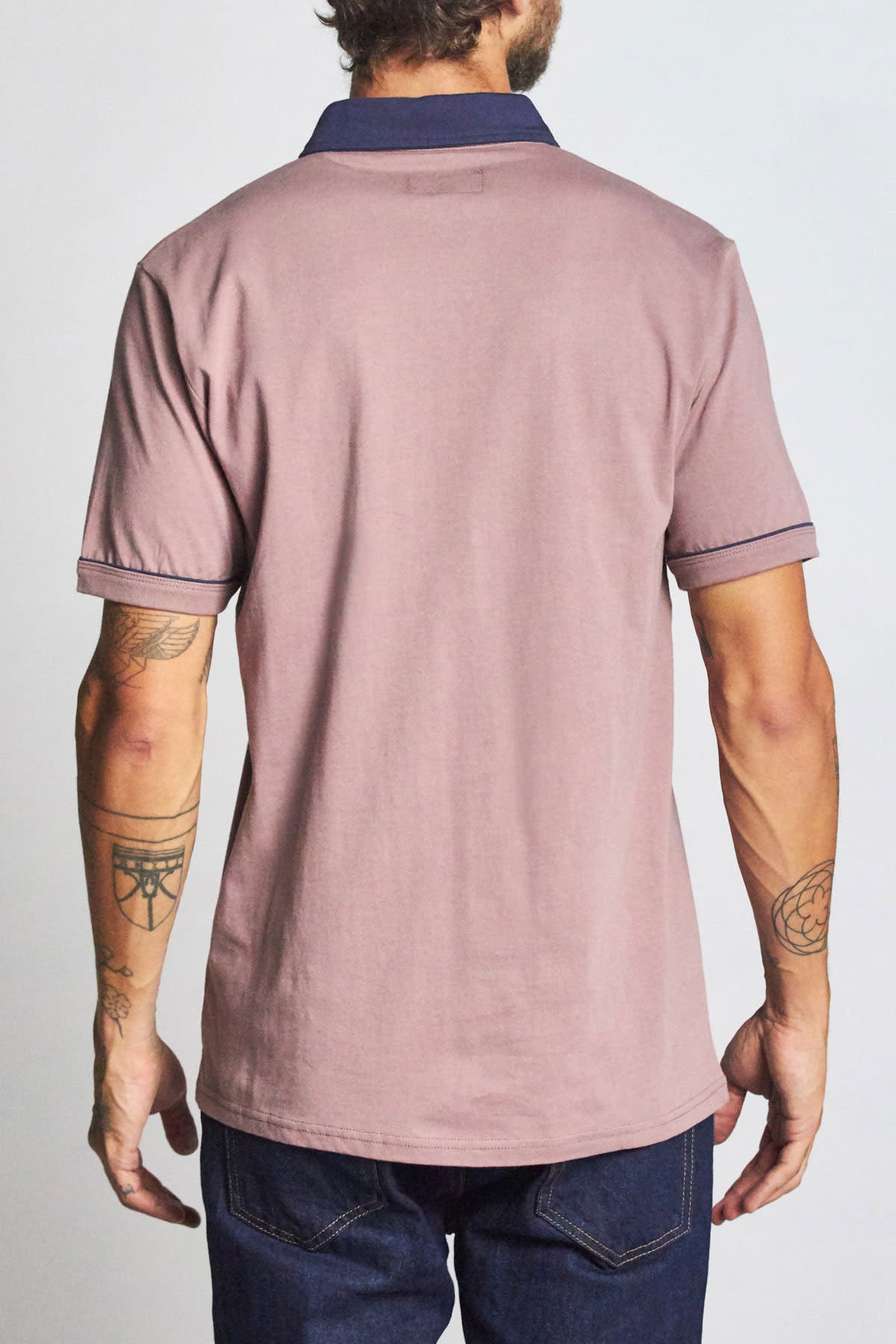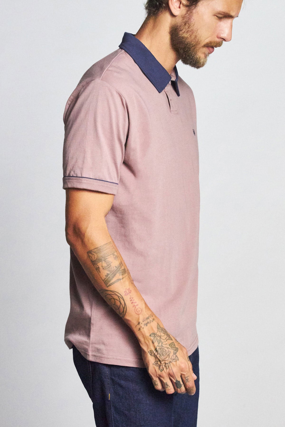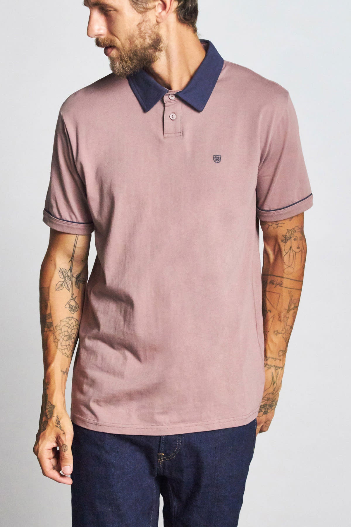 A 185-gram short-sleeved polo knit top. It features a 1X1 rib at the binded sleeve openings with contrast piping, two-button placket, and a Brixton B-shield embroidery at left chest.