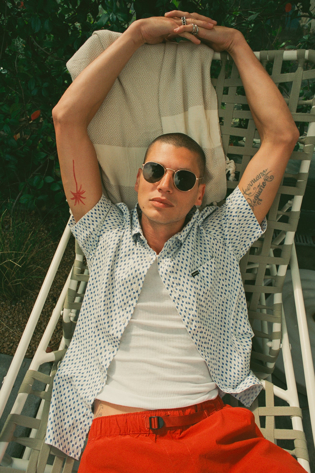 This collared shirt is designed to stand out. Crafted with a stretchy cotton poly blend and featuring original prints and patterns from San Diego artist, Mitch King. It’s been treated with an enzyme wash to create an oh-so-soft feel.