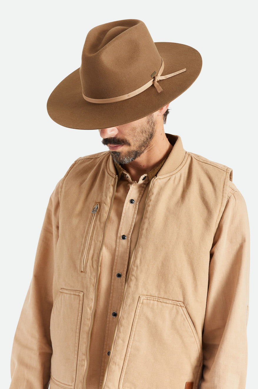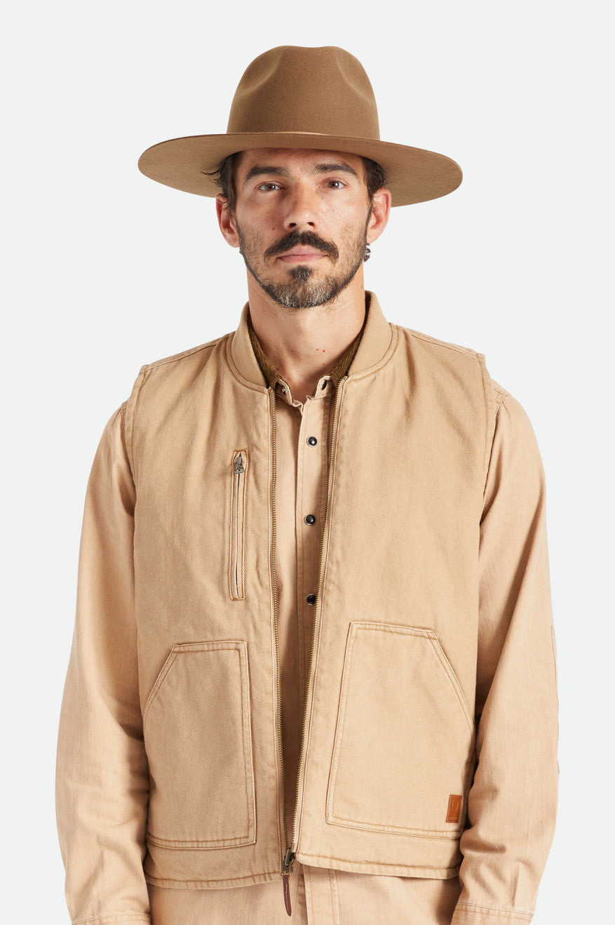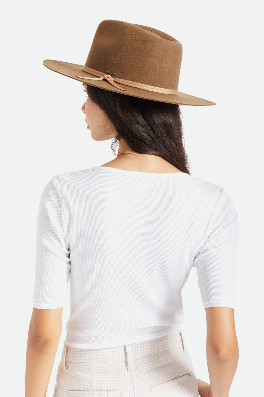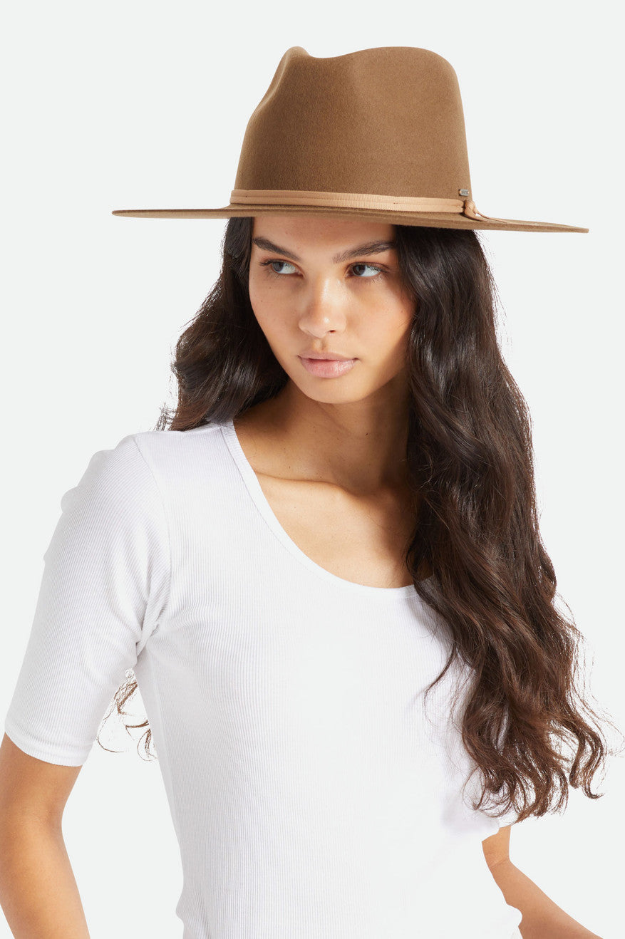 A structured wide-brim hat with a raw edge. Made from certified responsibly sourced wool felt that meets the Responsible Wool Standard for Sustainability. Find your perfect fit with the adjustable interior sweatband. It's finished with a thin grosgrain band and a metal Brixton pin.