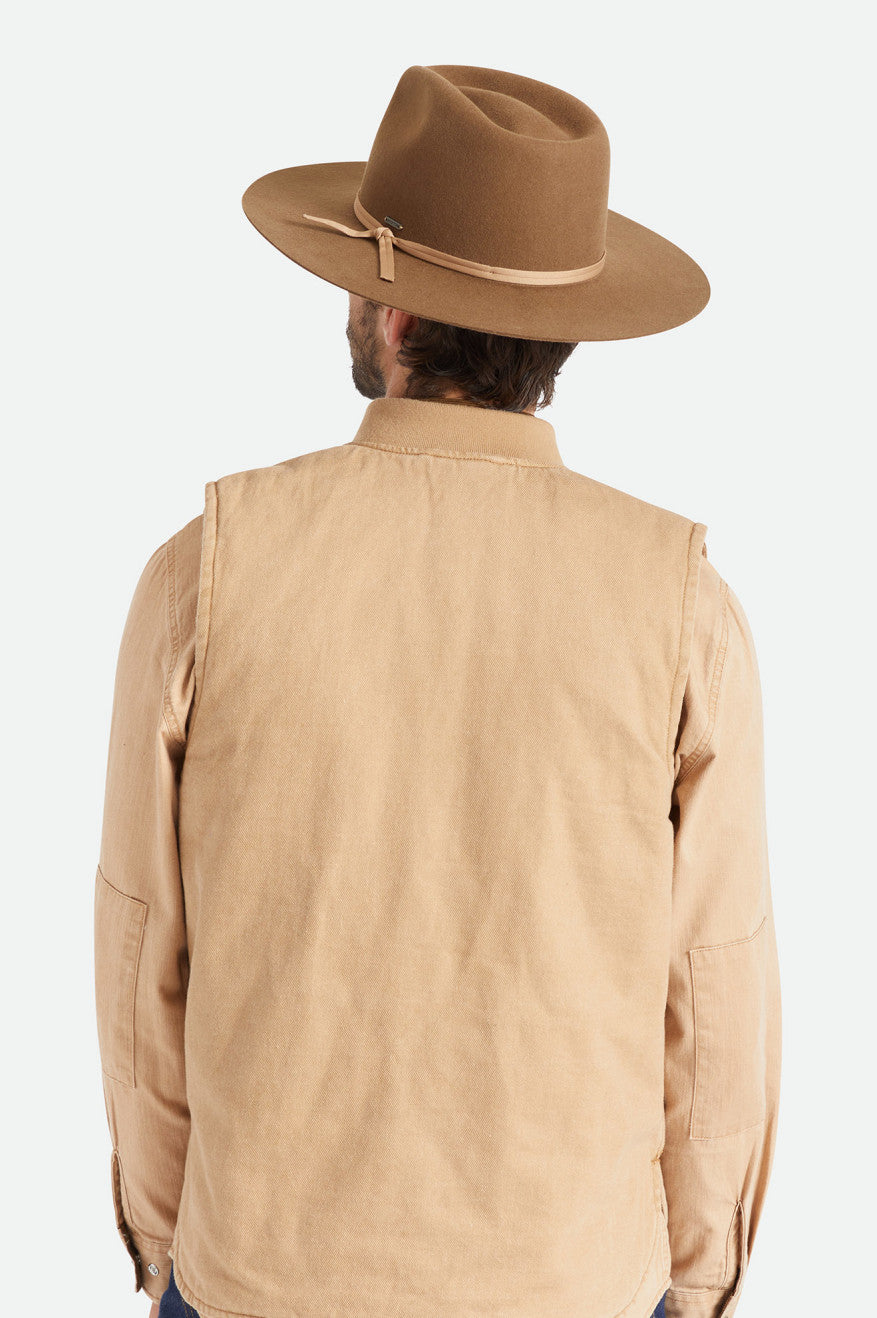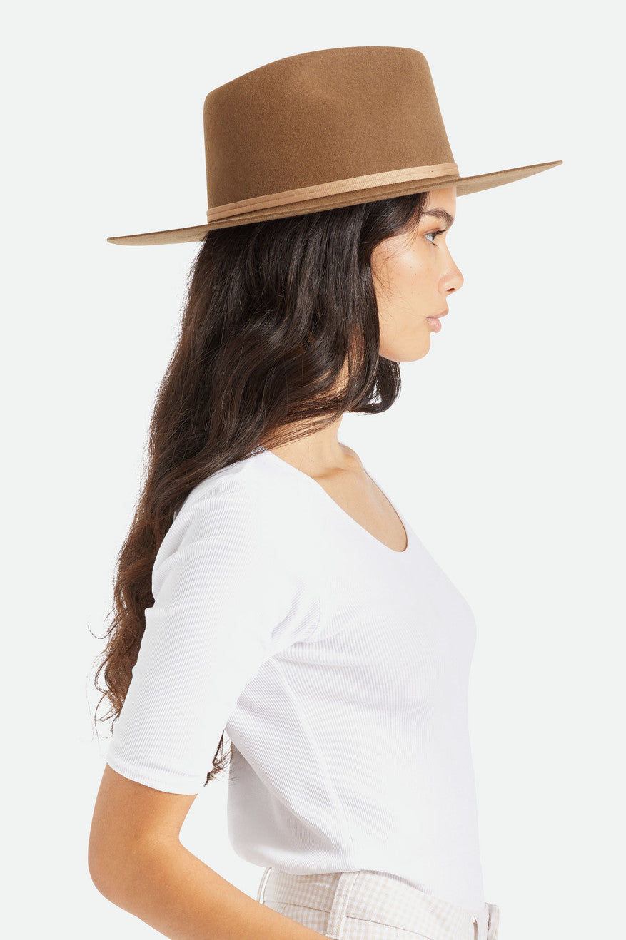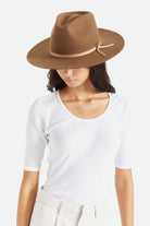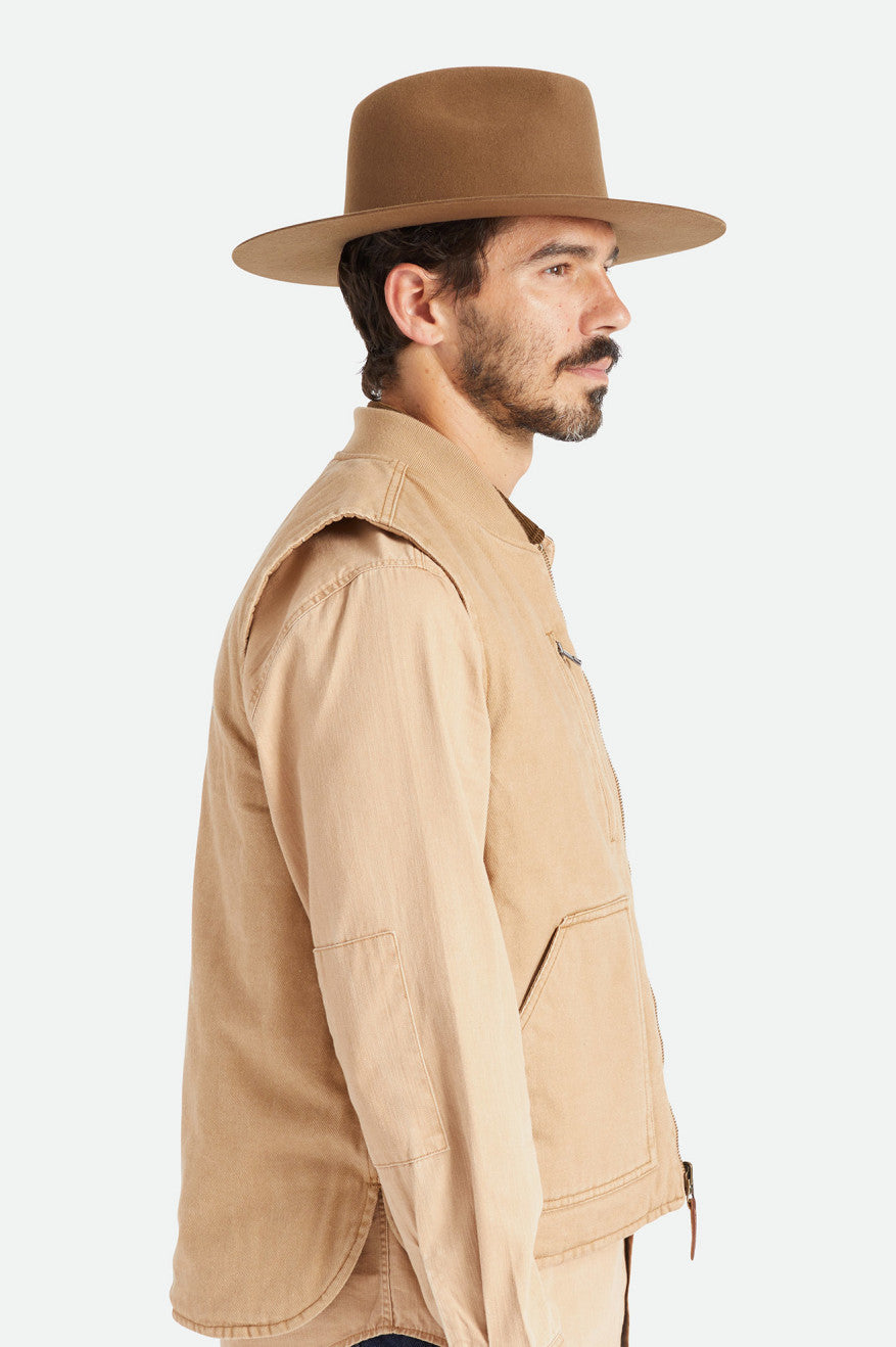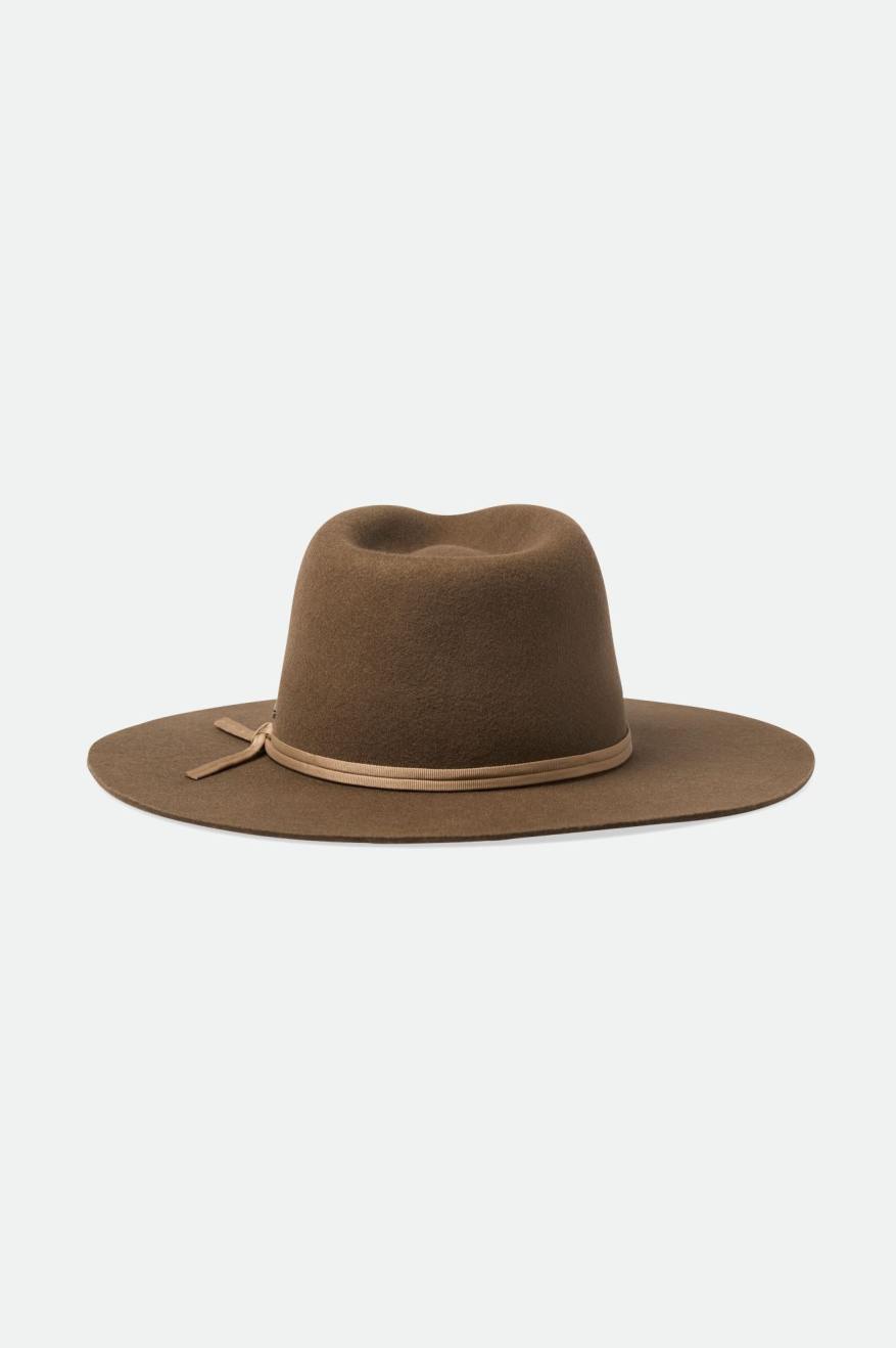 A structured wide-brim hat with a raw edge. Made from certified responsibly sourced wool felt that meets the Responsible Wool Standard for Sustainability. Find your perfect fit with the adjustable interior sweatband. It's finished with a thin grosgrain band and a metal Brixton pin.