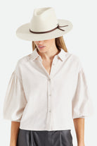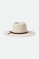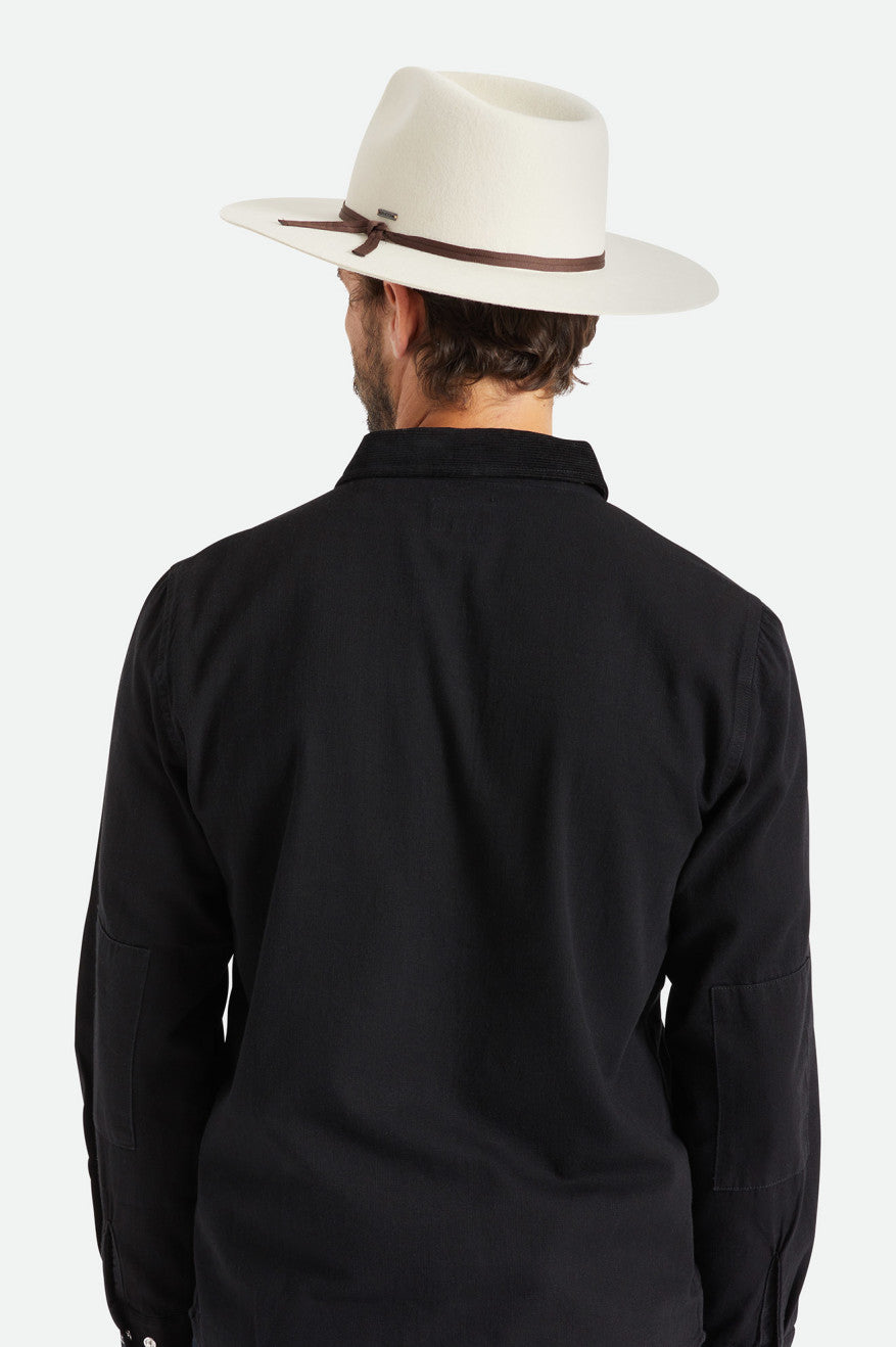 A structured wide-brim hat with a raw edge. Made from 100% Australian wool felt. Find your perfect fit with the adjustable interior sweatband. It's finished with a thin grosgrain band and a metal Brixton pin.