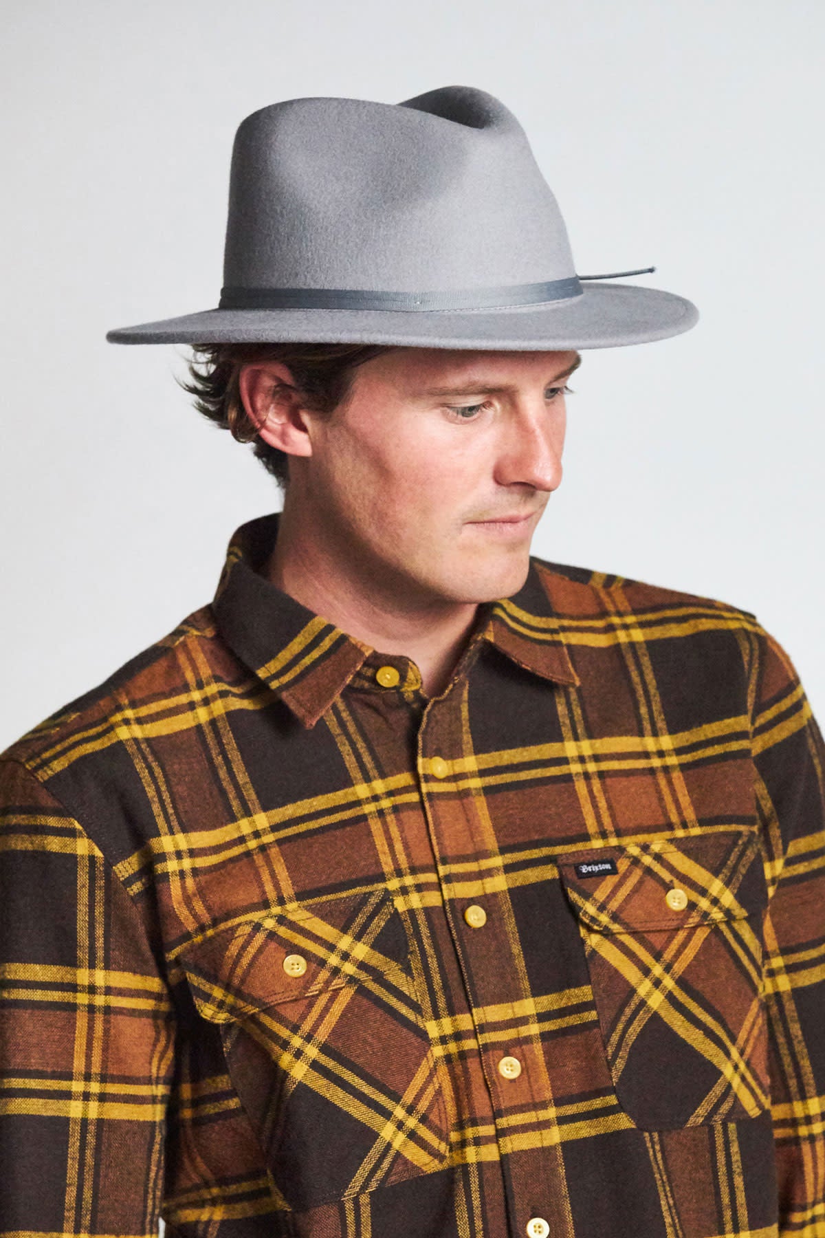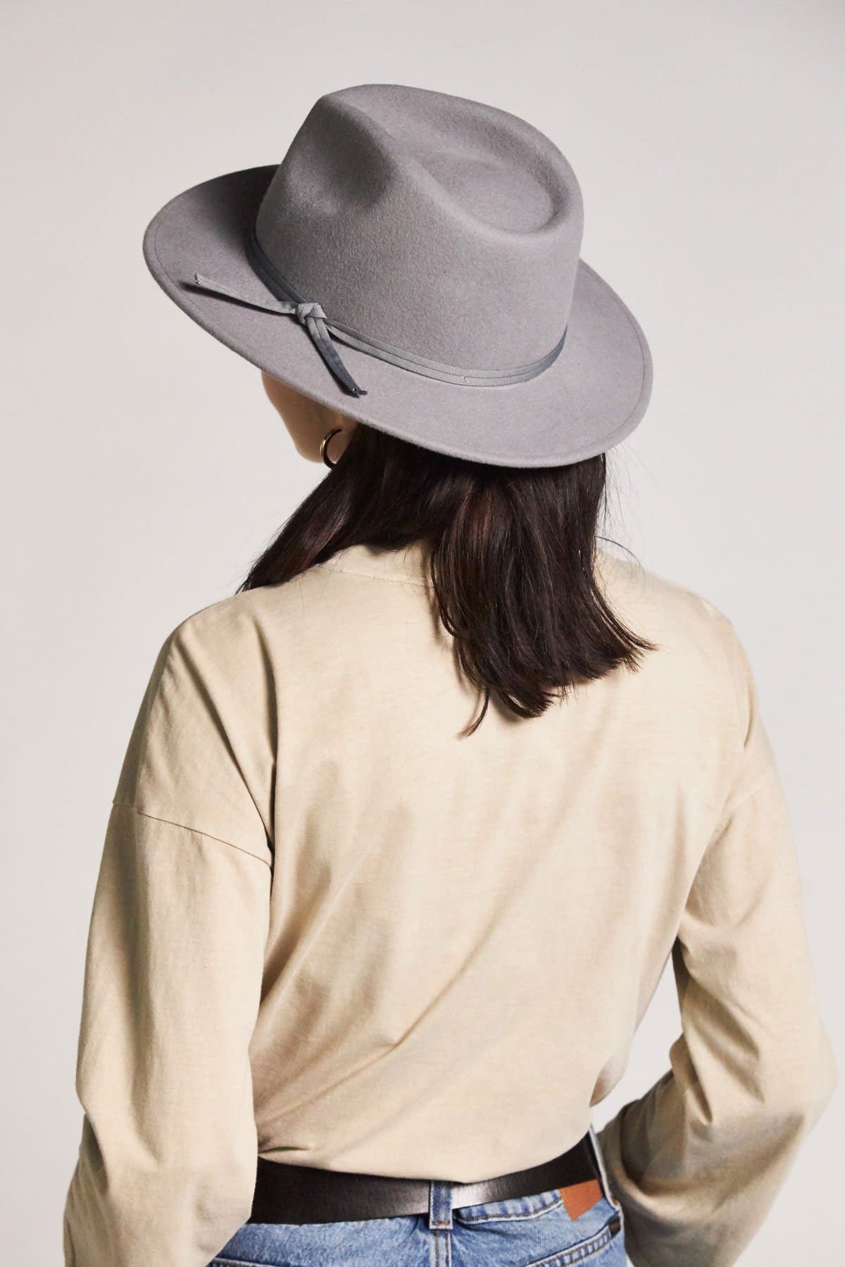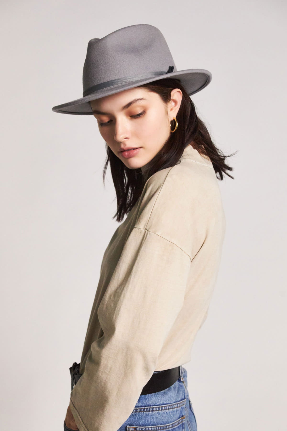 A unisex medium flat-brim felt fedora with a quilted grosgrain band. Color: Aluminum.