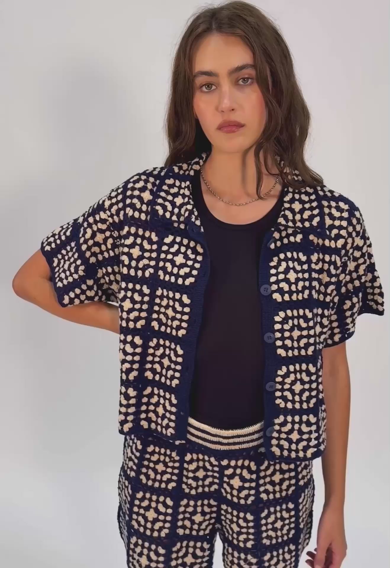 Keep it breezy and ultra-stylish this summer with the Crochet Short Sleeve Button Down. This lightweight, breathable cotton crochet top is truly handcrafted, featuring an intricate indigo and off-white pattern for a vintage-inspired look that stands out. It's made in a laid-back camp collar button-down style with short sleeves, making it easygoing and eye-catching. This isn't just a top; it's your perfect warm-weather essential for staying on-trend while keeping cool.