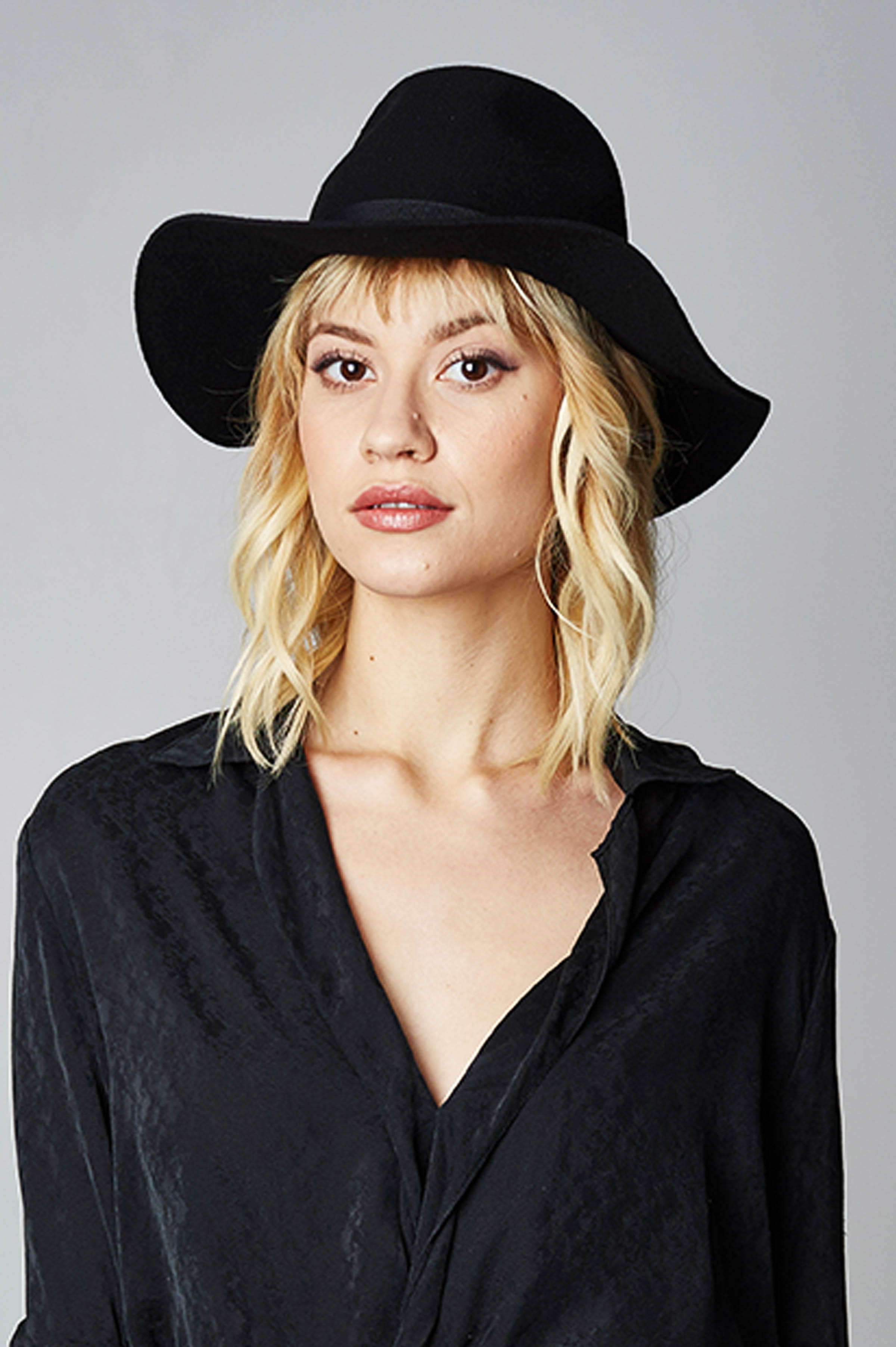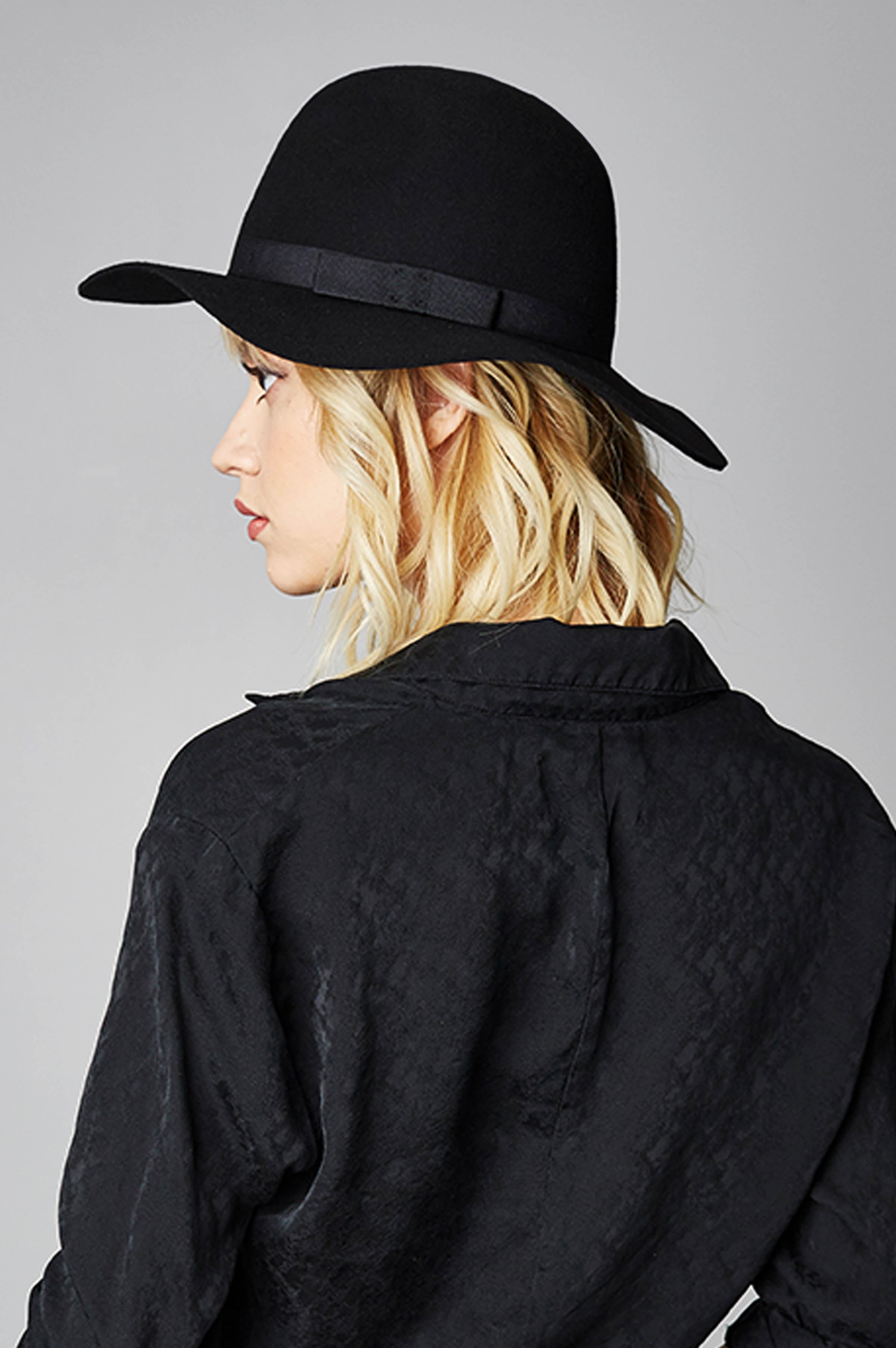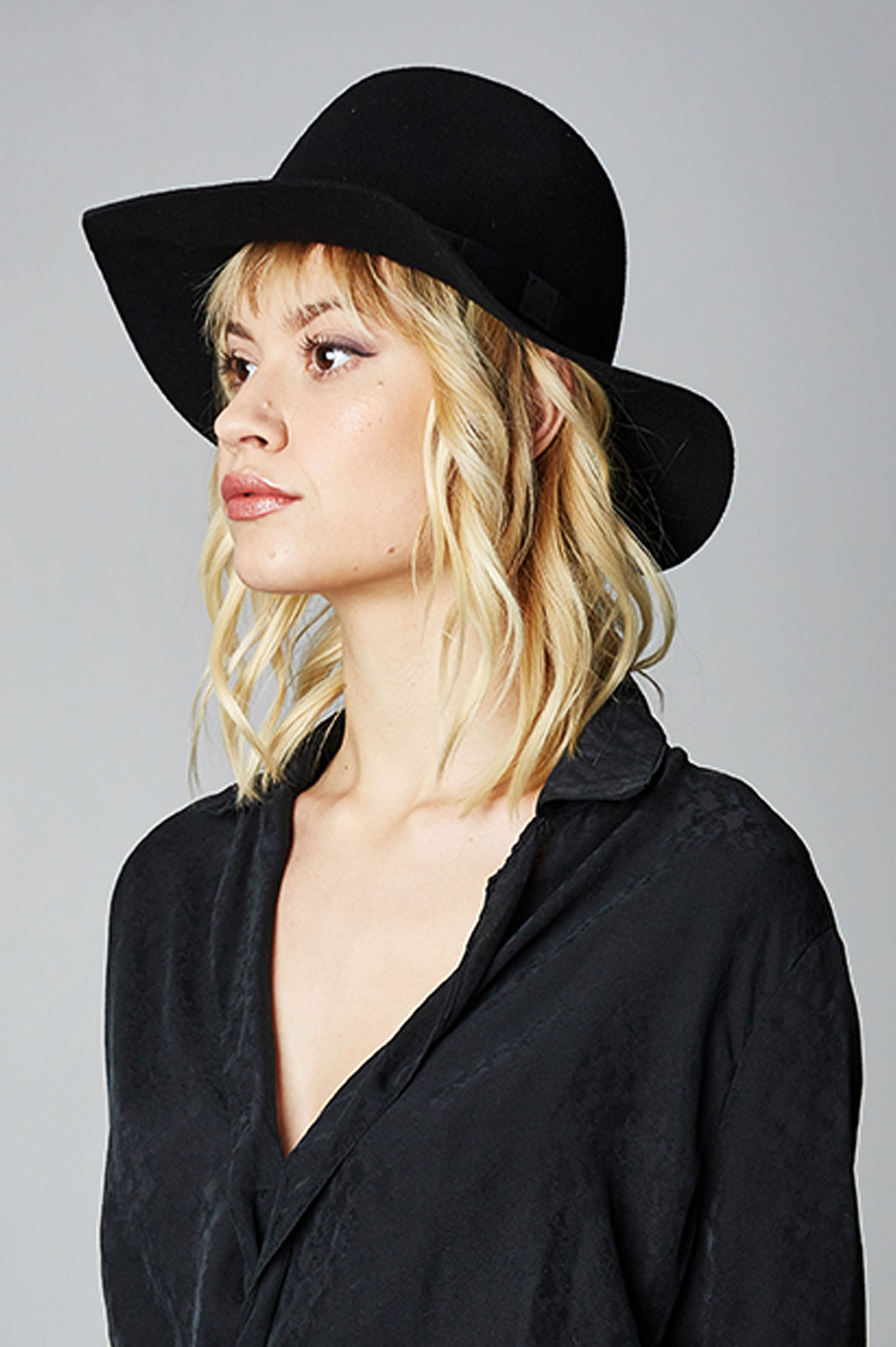 The Dalila is a medium-brim floppy felt hat with a grosgrain band.