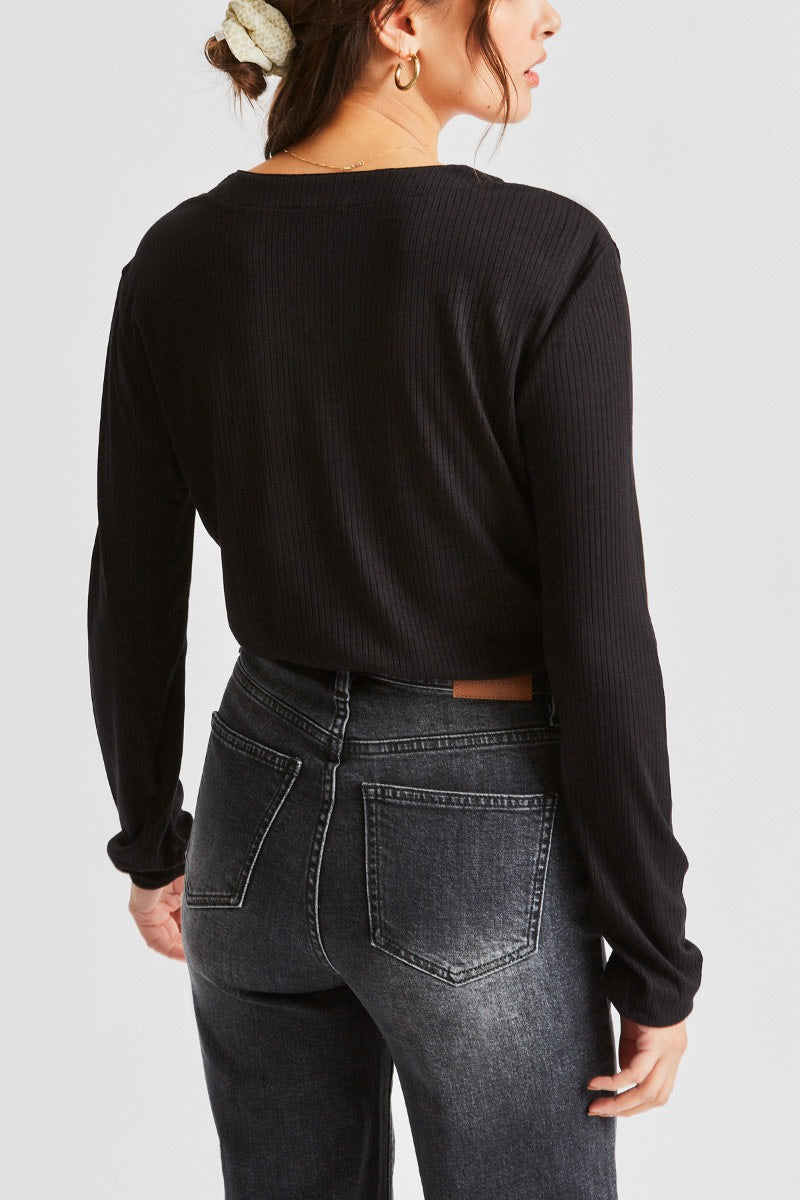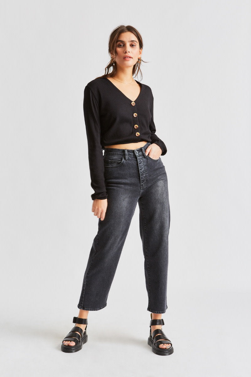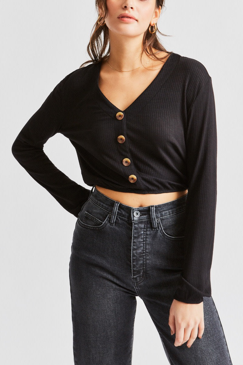 The Daria is made of a viscose and elastane blend flat rib, featuring comfortable stretch. Contrasting tortoise buttons and a blouson fit give this piece an elevated feel.