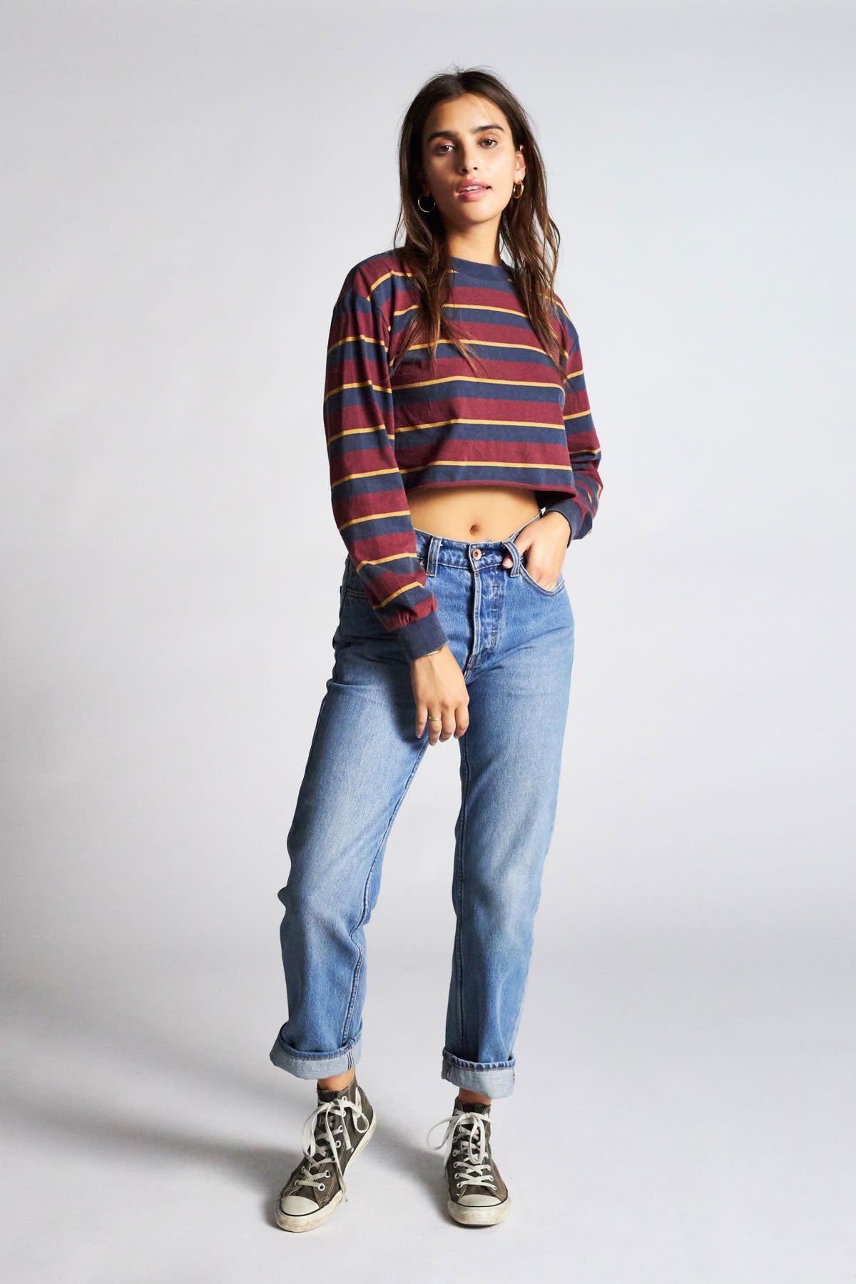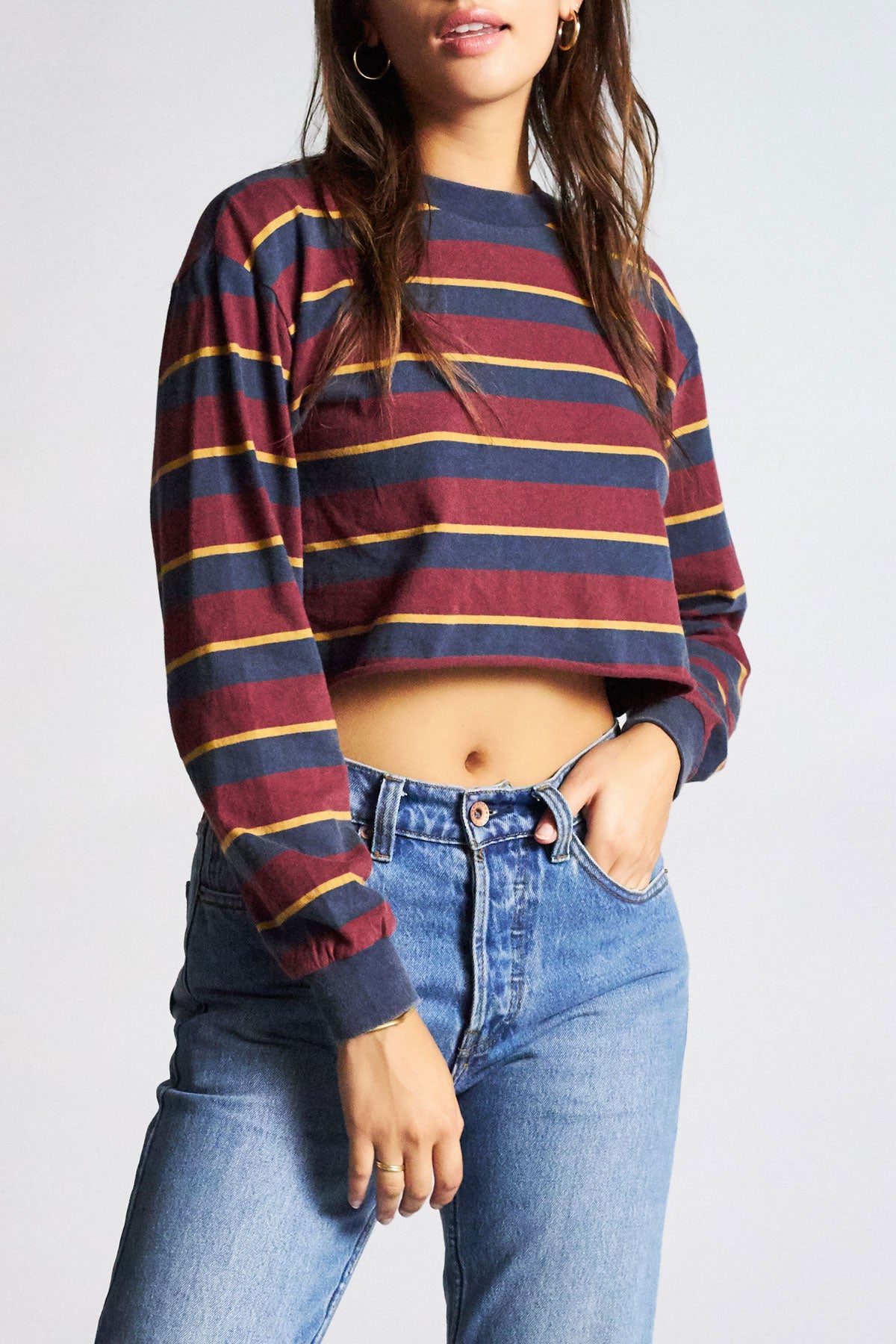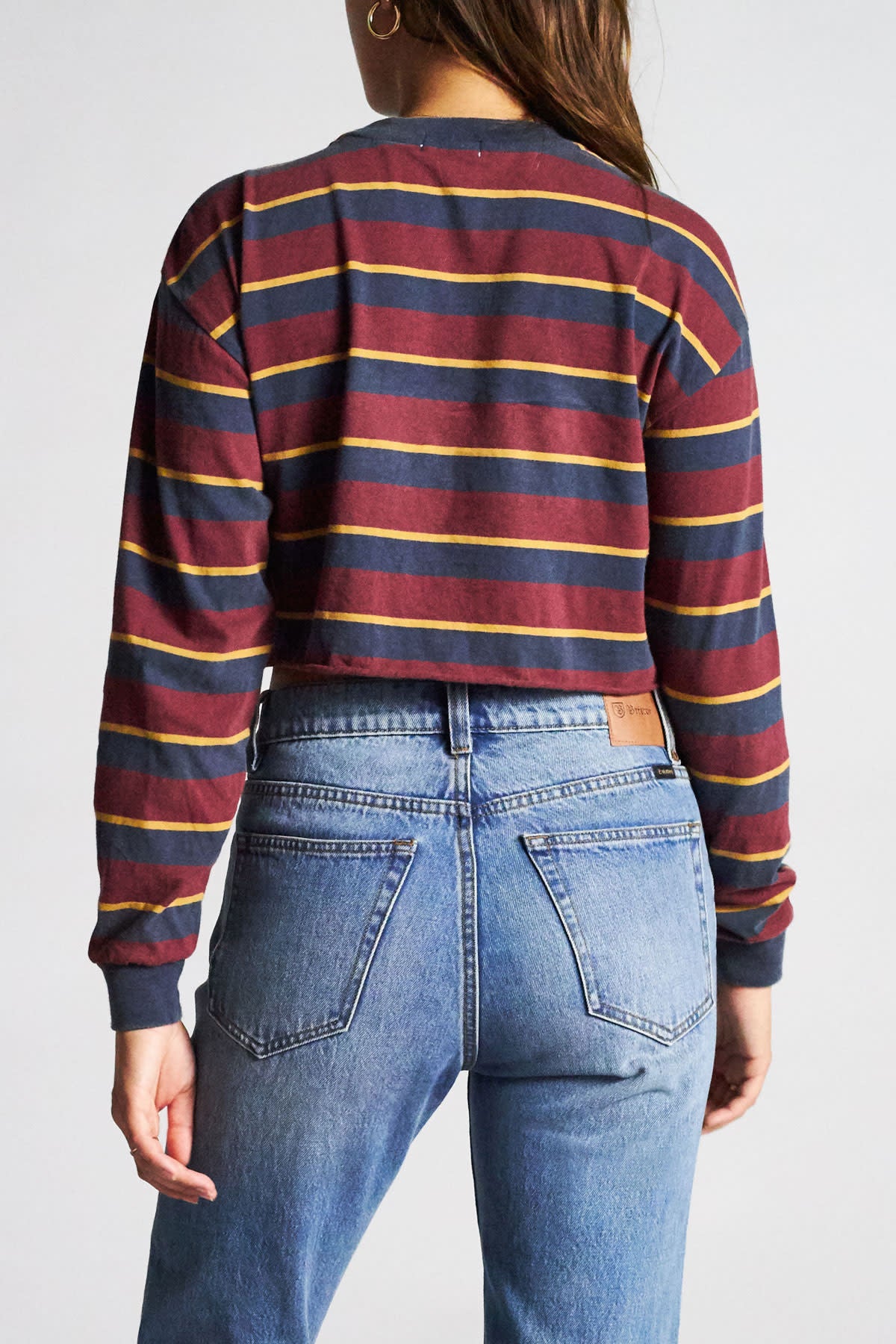 A boyfriend-fit, long-sleeve tee made in 150-gram yarn-dyed cotton jersey with 1x1 rib at neckline and sleeve cuffs. It features our custom Worn Wash, raw-cut hem crop fit, and woven Brixton labels.
