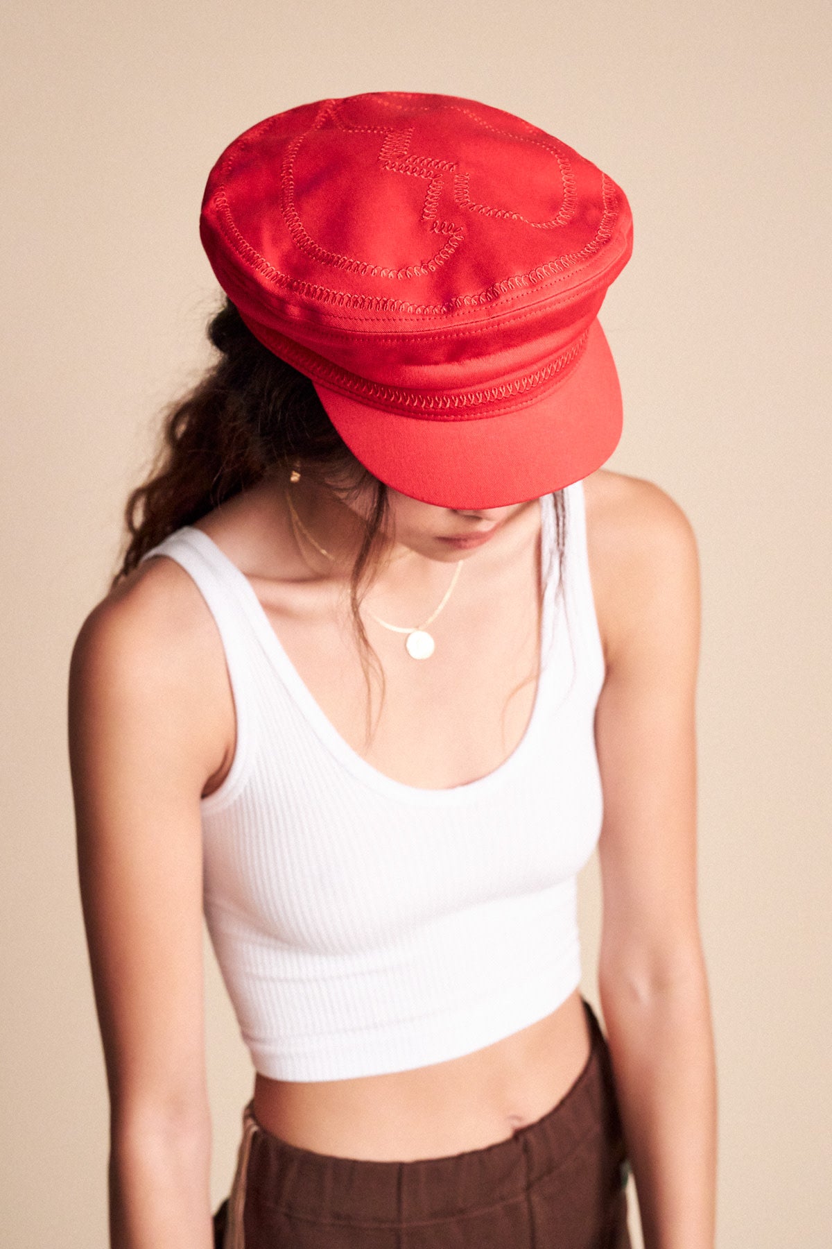 A cut-and-sew fisherman cap featuring custom direct embroidery art on crown.