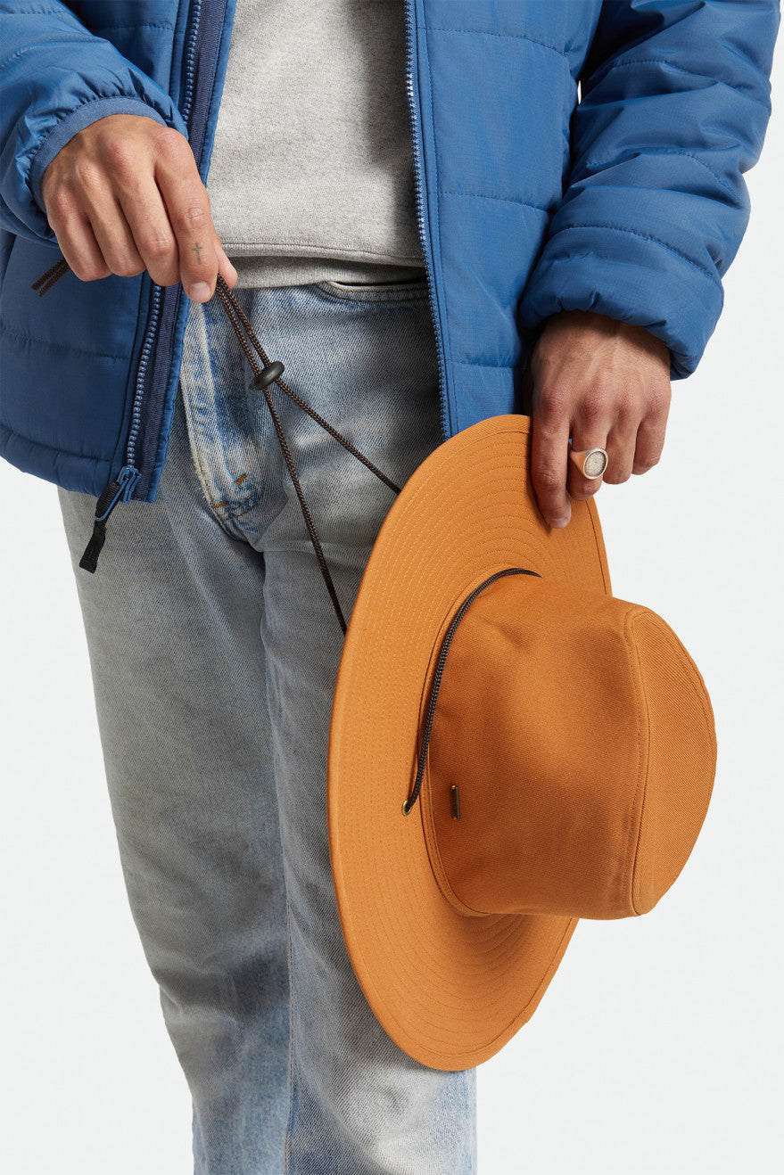 The Field Crossover Hat is a wide brim, polyester twill hat featuring recycled materials and water repellent coating which makes it a great choice, no matter the season. Featuring a nylon band and neck rope, it's finished off with a metal hardware plaque that gives it an elevated look. The adjustable Velcro strap under the sweatband makes it easy to find your perfect size. If you're not sure which to choose, we suggest you size up and use the hidden adjuster to perfectly tailor the fit.