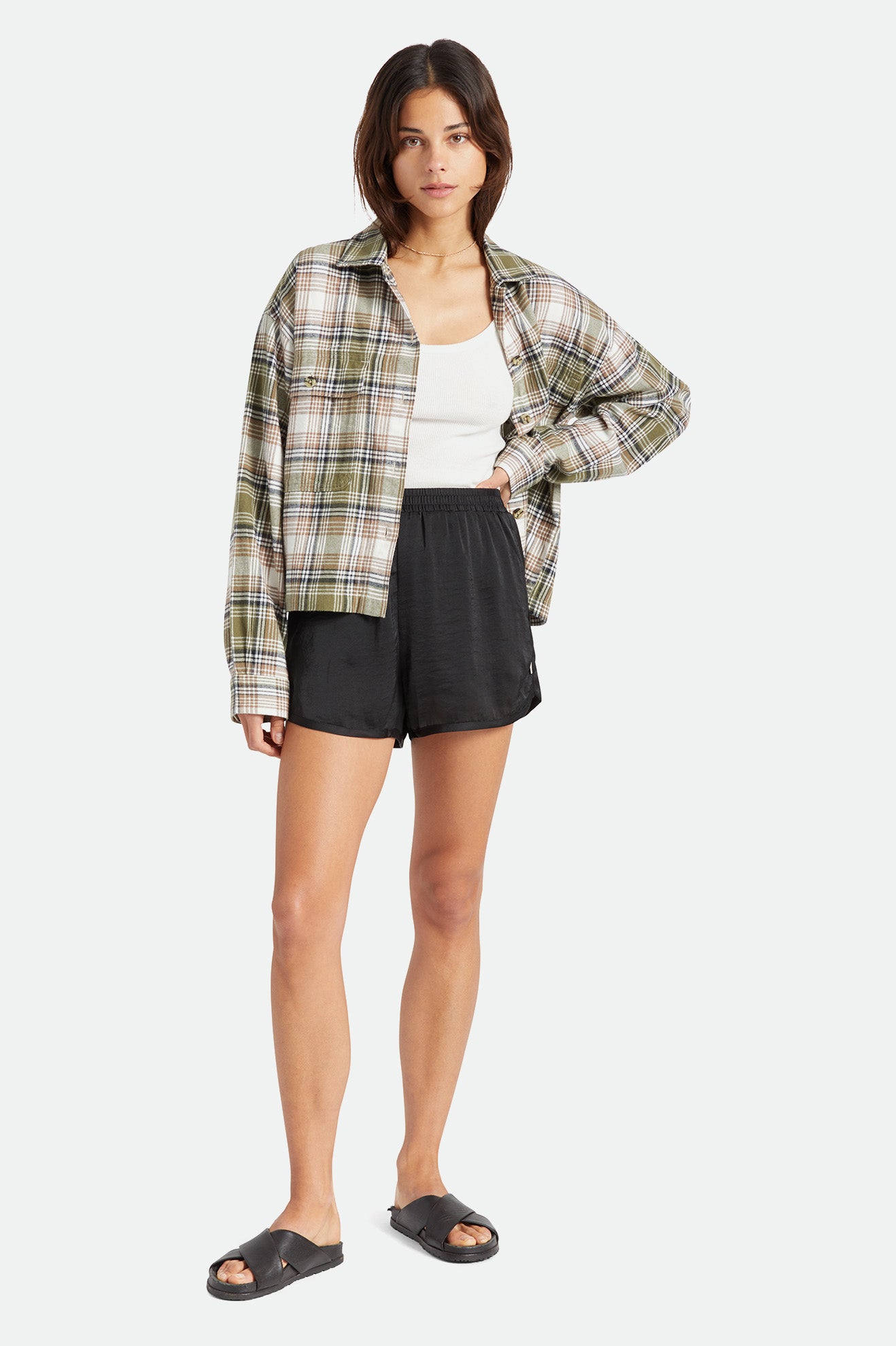 The Flight Runners are a retro-style short in flowy, polyester satin. An elastic waistband sits at your natural waistline while scalloped side seams finish the legs. Ideal for travel or beach days.