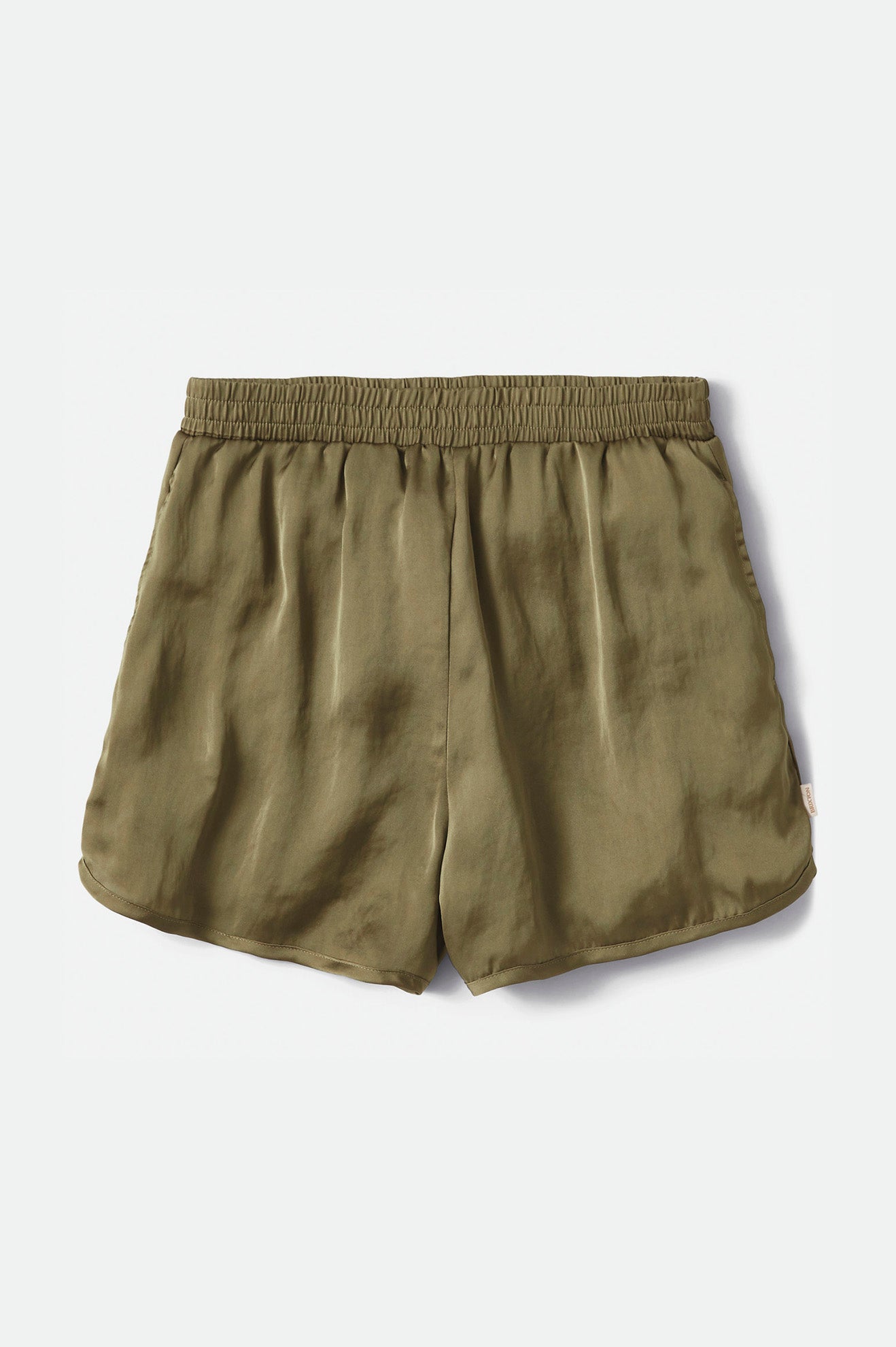 The Flight Runners are a retro-style short in flowy, polyester satin. An elastic waistband sits at your natural waistline while scalloped side seams finish the legs. Ideal for travel or beach days.