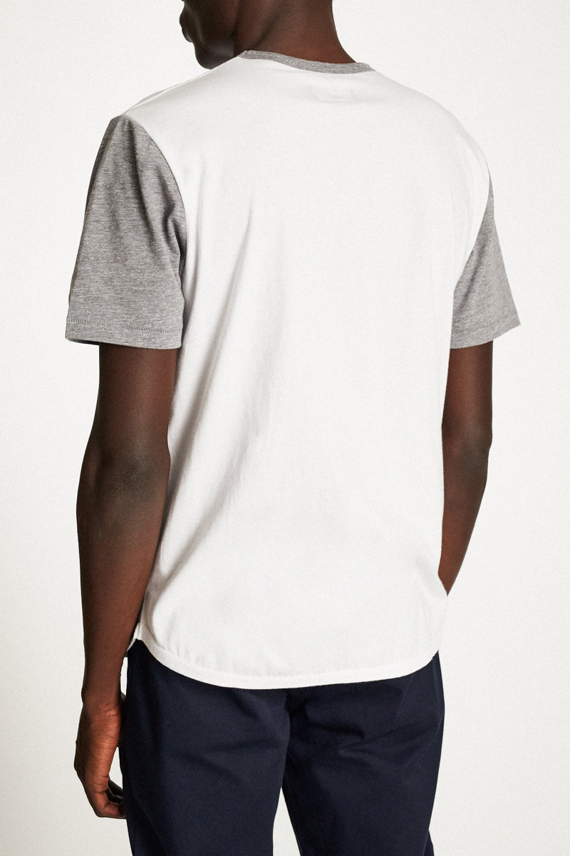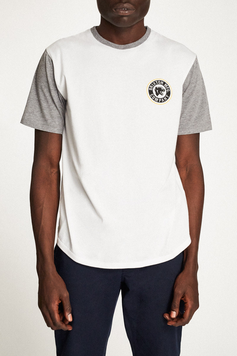 A 150-gram jersey short-sleeved knit top that features binding at bottom hem, a binded-neck collar, and screen print at left chest. Delivery 6/15