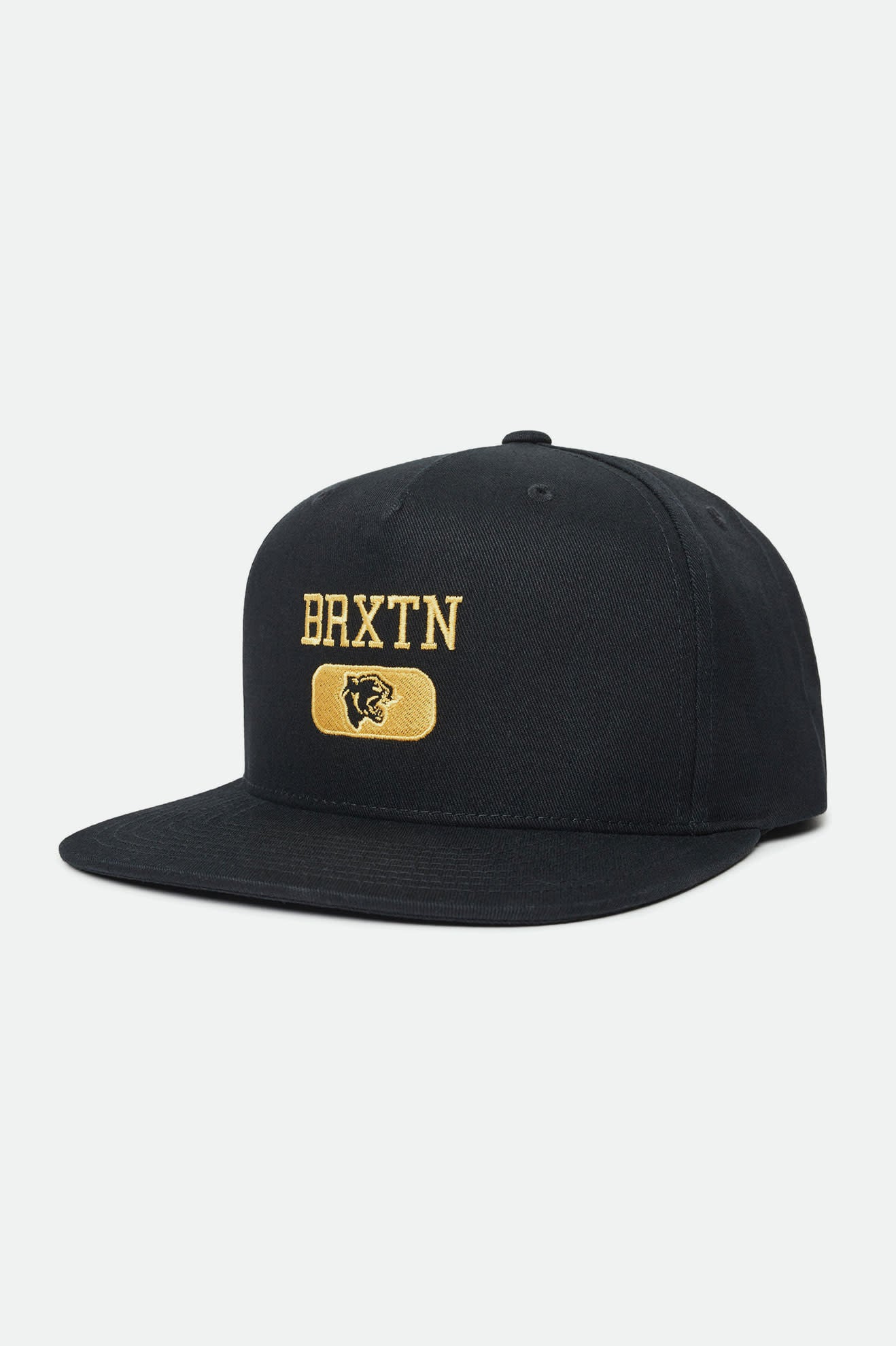 The Forte VI MP snapback is a men's unisex, five-panel cut-and-sew cotton twill snapback hat featuring a direct embroidery and a plastic snap. Color: Black.