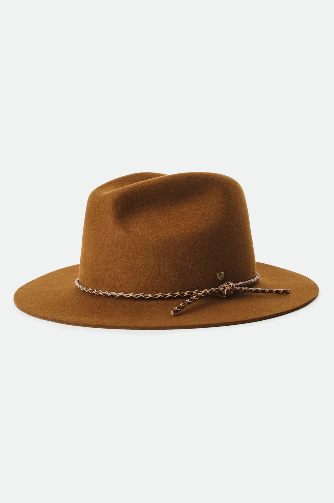 The Freeport II is a men's unisex, medium unfinished-brim felt fedora hat with a braided leather strap. Color: Coffee.