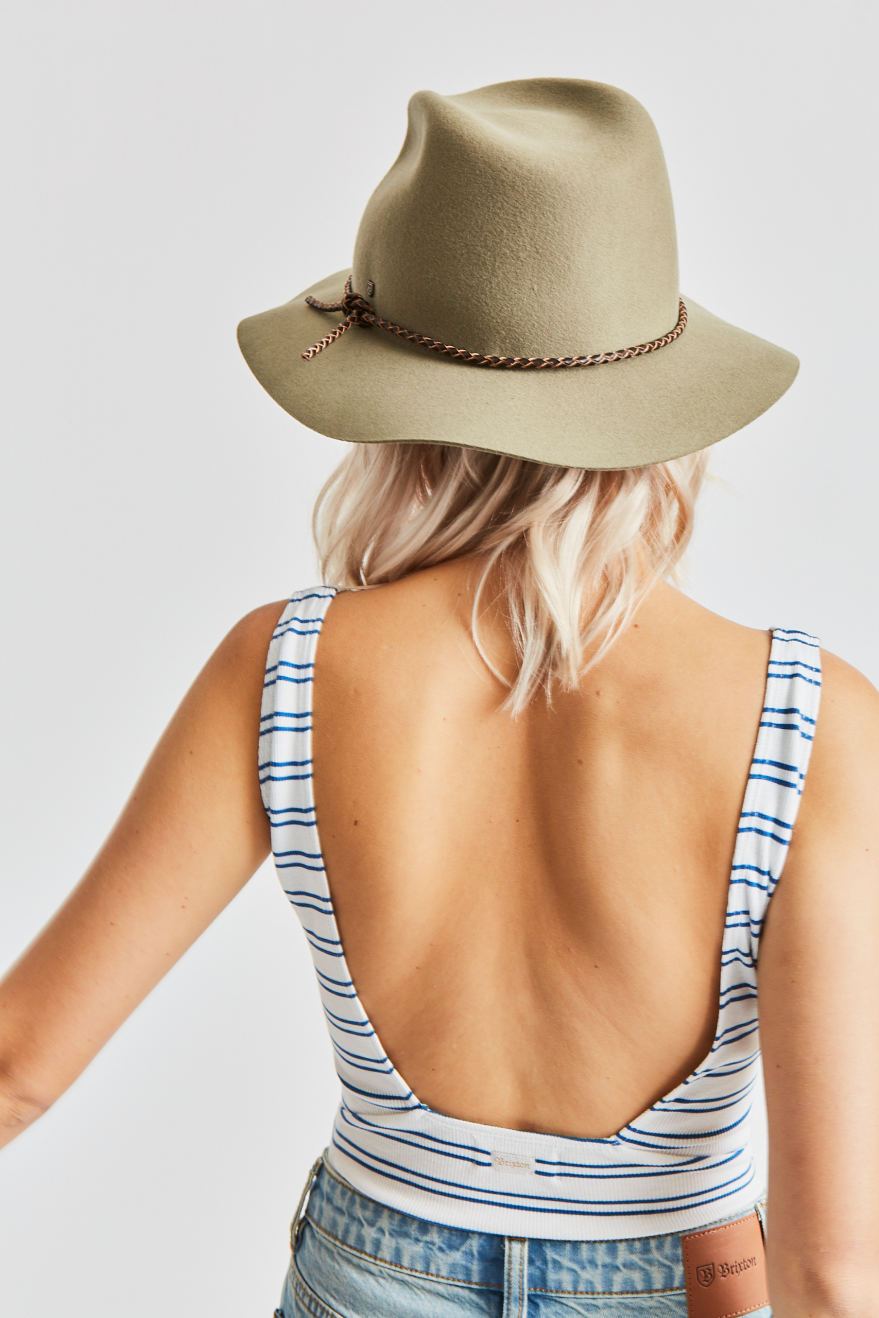 The Freeport II is a men's unisex, medium unfinished-brim felt fedora hat with a braided leather strap. Color: Light Olive.