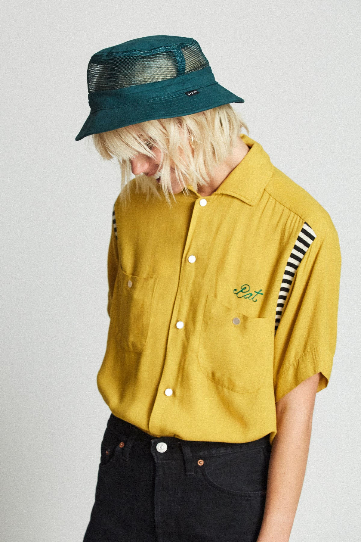 The Hardy is a men's unisex, short-brim cotton bucket hat with a nylon mesh crown panel and a woven Brixton label. Color: Evergreen.