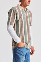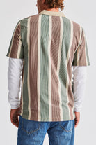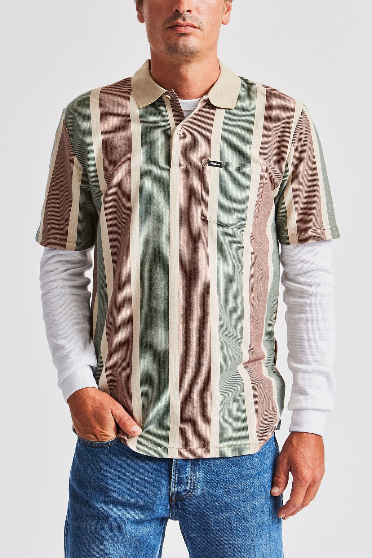The Brixton Hilt S/S Polo is a 150-gram short-sleeve polo-knit top featuring yarn-dyed stripes, a rib-knit striped collar, a patch pocket with our woven Brixton pocket label, and a two-button placket.