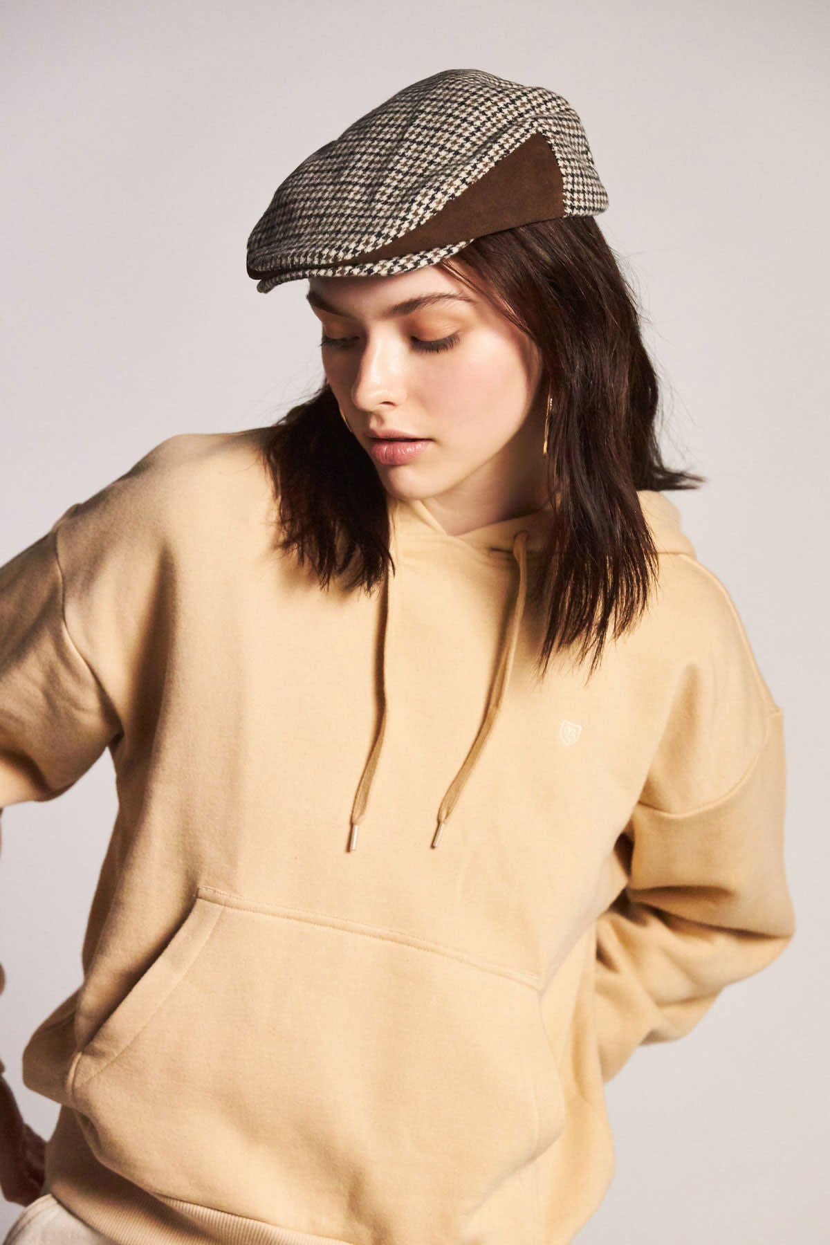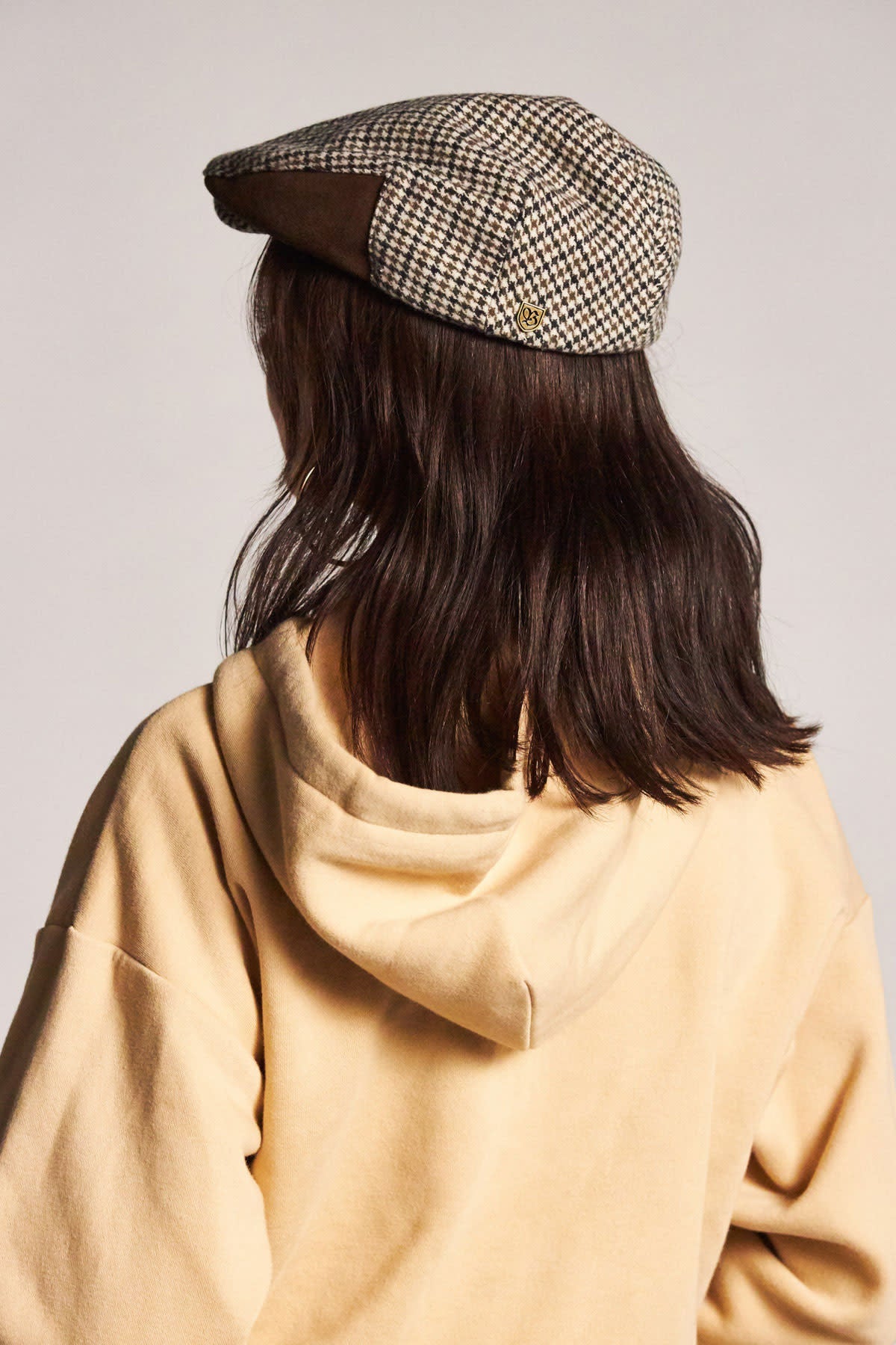 A unisex Hooligan II cut-and-sew snap cap with custom lining and a metal Brixton B-Shield. Color: Vanilla/Brown.