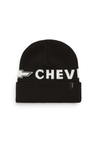 The Brixton Icon Beanie is a men's unisex, standard acrylic 2x1 rib-knit beanie with custom intarsia Chevrolet logos. Color: Bel Air Black.