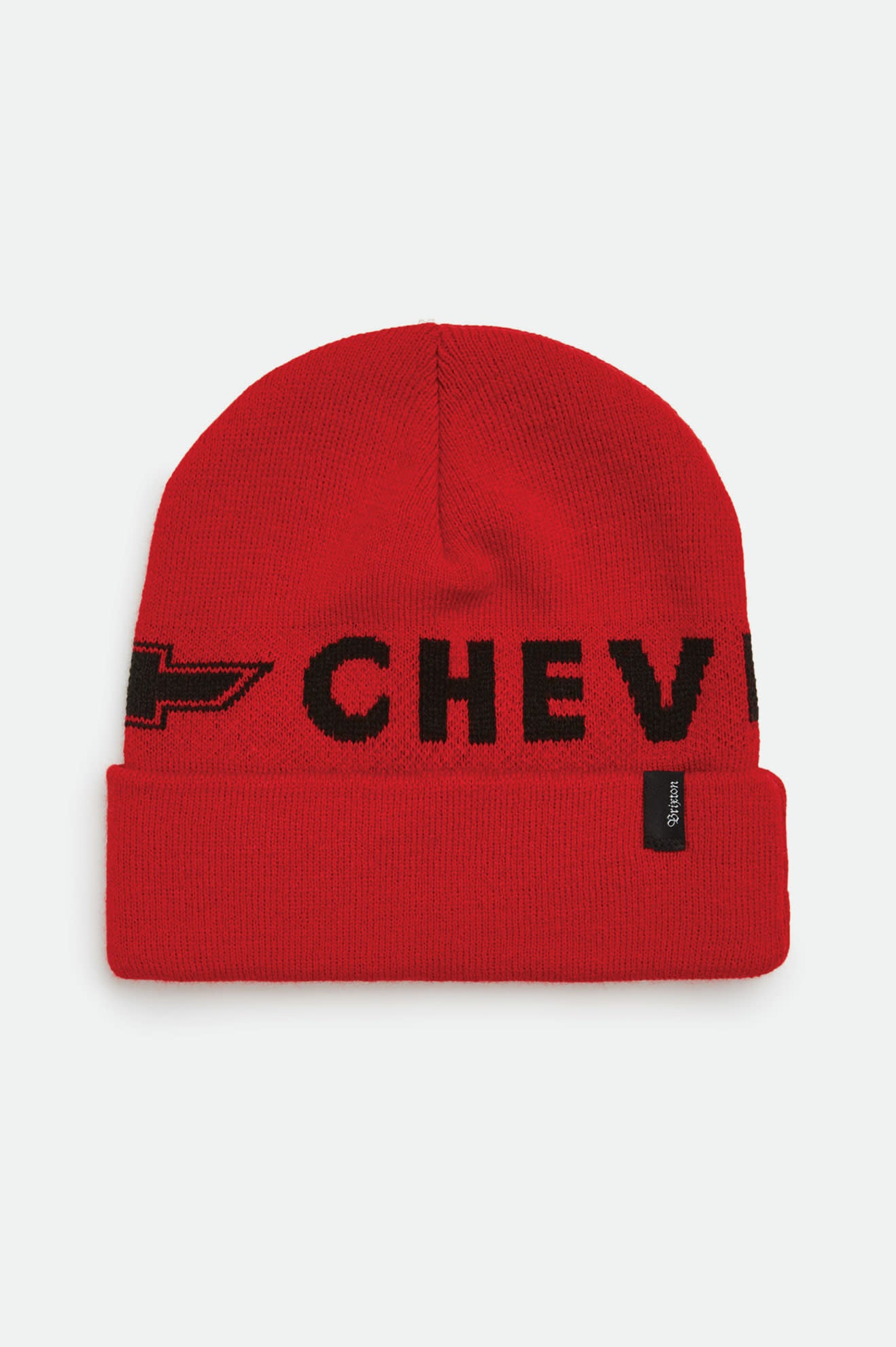 The Brixton Icon Beanie is a men's unisex, standard acrylic 2x1 rib-knit beanie with custom intarsia Chevrolet logos. Color: Nova Red.
