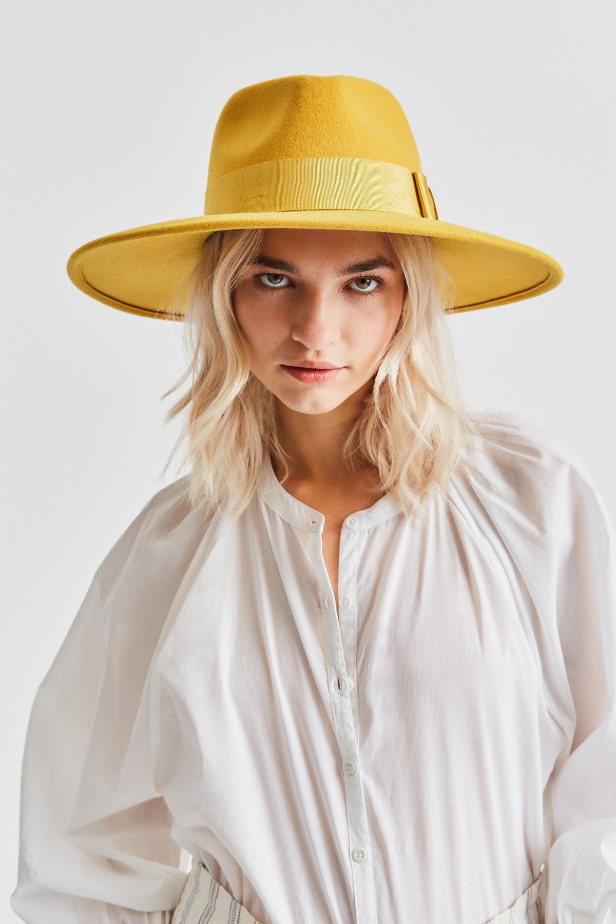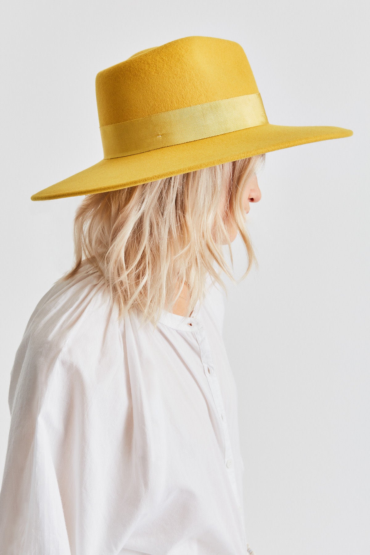 An elegant wide-brim hat with a simple grosgrain band.