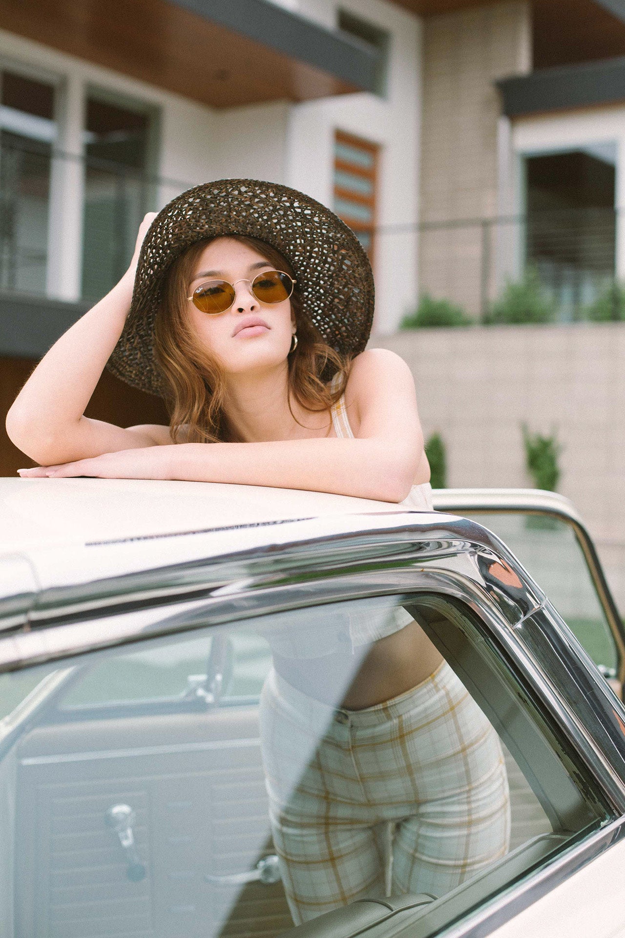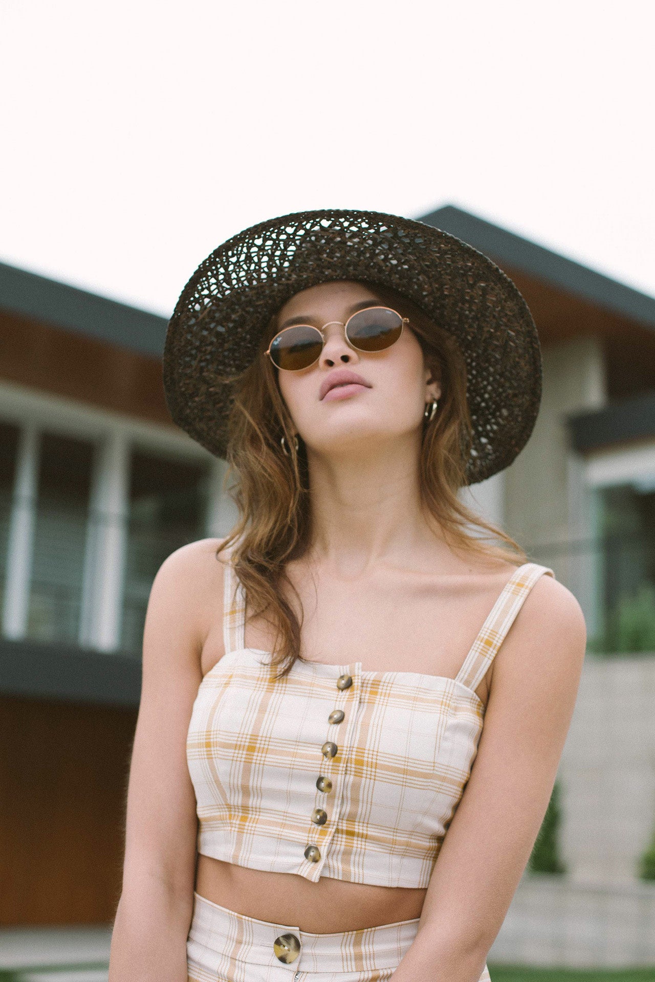 A wide-brim straw sun hat featuring an open-weave pattern on crown and brim.