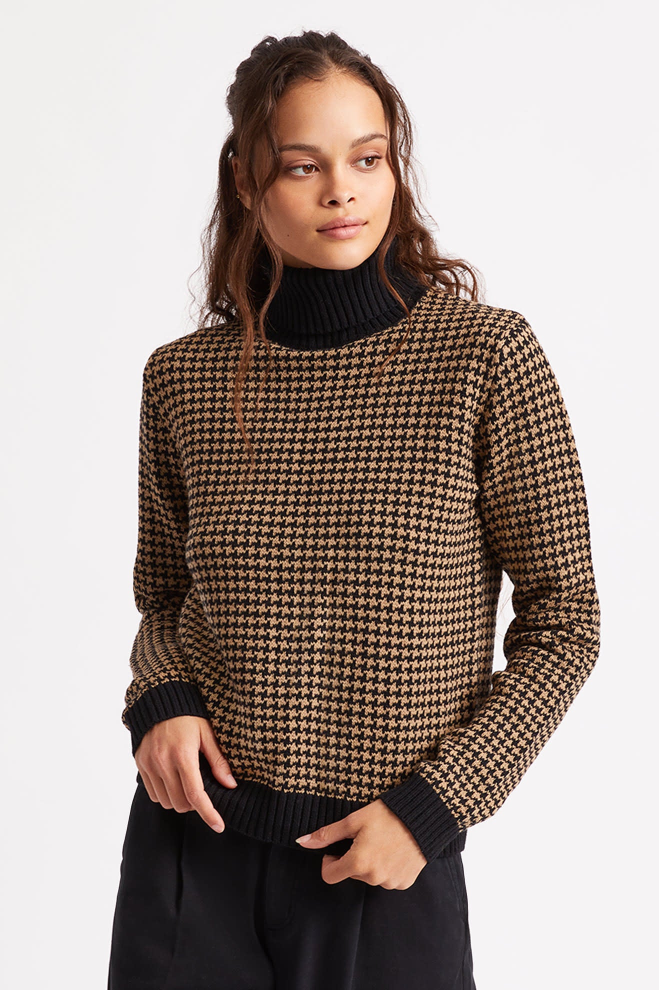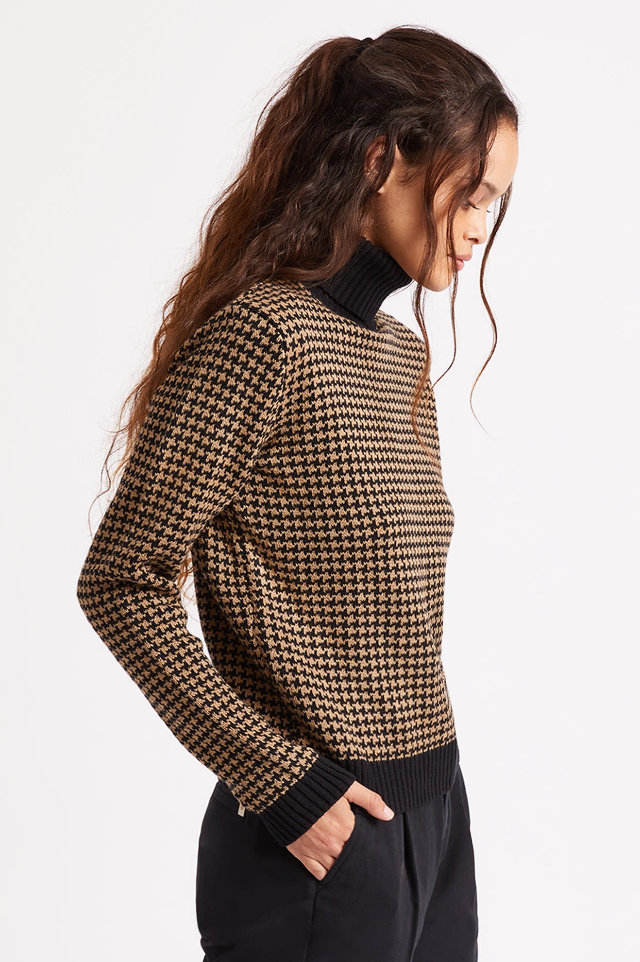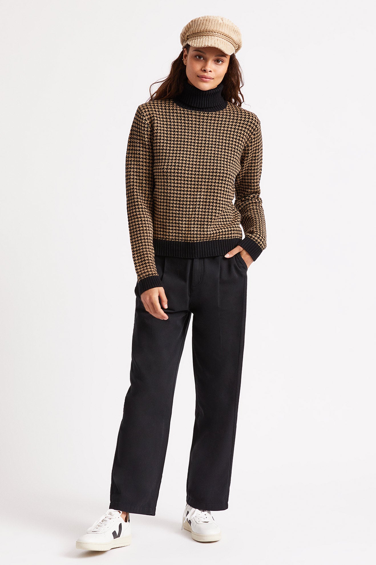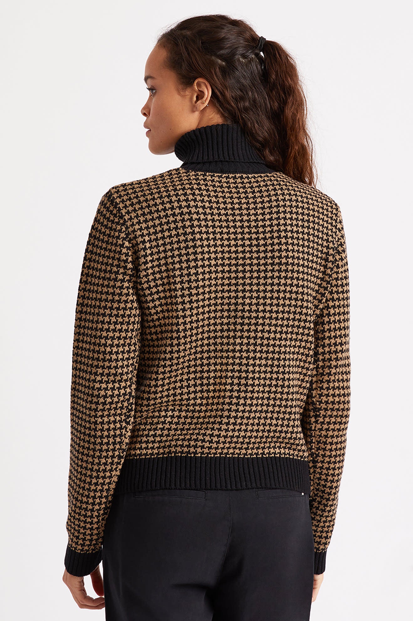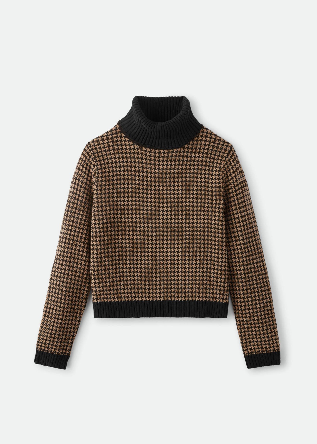 The cotton and acrylic jacquard knit is set off with a solid ribbed neckline, waistband, and cuffs, giving off a sharp and put-together effect for any day.